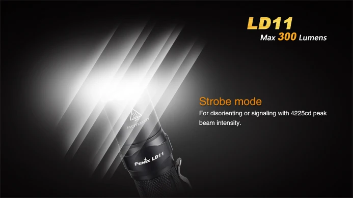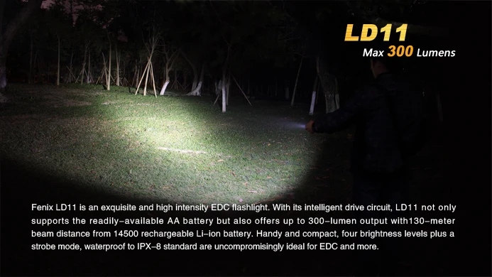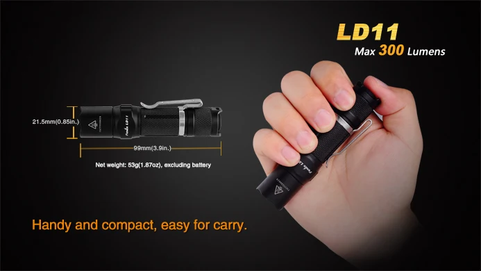 Description Fenix LD11 is an exquisite and high intensity EDC flashlight. With its intelligent drive circuit, LD11 not only supports the readily-available AA battery but also offers up to 300-lumen output with130-meter beam distance from 14500 rechargeable Li-ion battery. Handy and compact, four brightness levels plus a strobe mode, waterproof to IPX-8 standard are uncompromisingly ideal for EDC and more. Features ·Uses Cree XP-G2 R5 white light LED with a lifespan of 50,000 hours ·Powered by one 14500 rechargeable Li-ion battery or one AA battery ·99mm×21.5mm (3.9in.×0.85in.) ·53-gram weight (1.87oz), excluding battery ·Intelligent drive circuit for higher battery performance ·Digitally regulated output maintains constant brightness ·Low-voltage reminder indicates when battery replacement is needed ·Reverse polarity protection, to protect from improper battery installation ·Over-heat protection to avoid high-temperature of the surface ·Anti-roll, slip-resistant body design ·Push-button tail cap switch for output selection ·Made of durable aircraft-grade aluminum ·Premium Type III hard-anodized anti-abrasive finish ·Toughened ultra-clear glass lens with anti-reflective coating Included in the package LD11 flashlight x 1 Lanyard x1 Holster x 1 Body clip x 1 Spare O-ring x 1 User manual x1 Warranty card x1