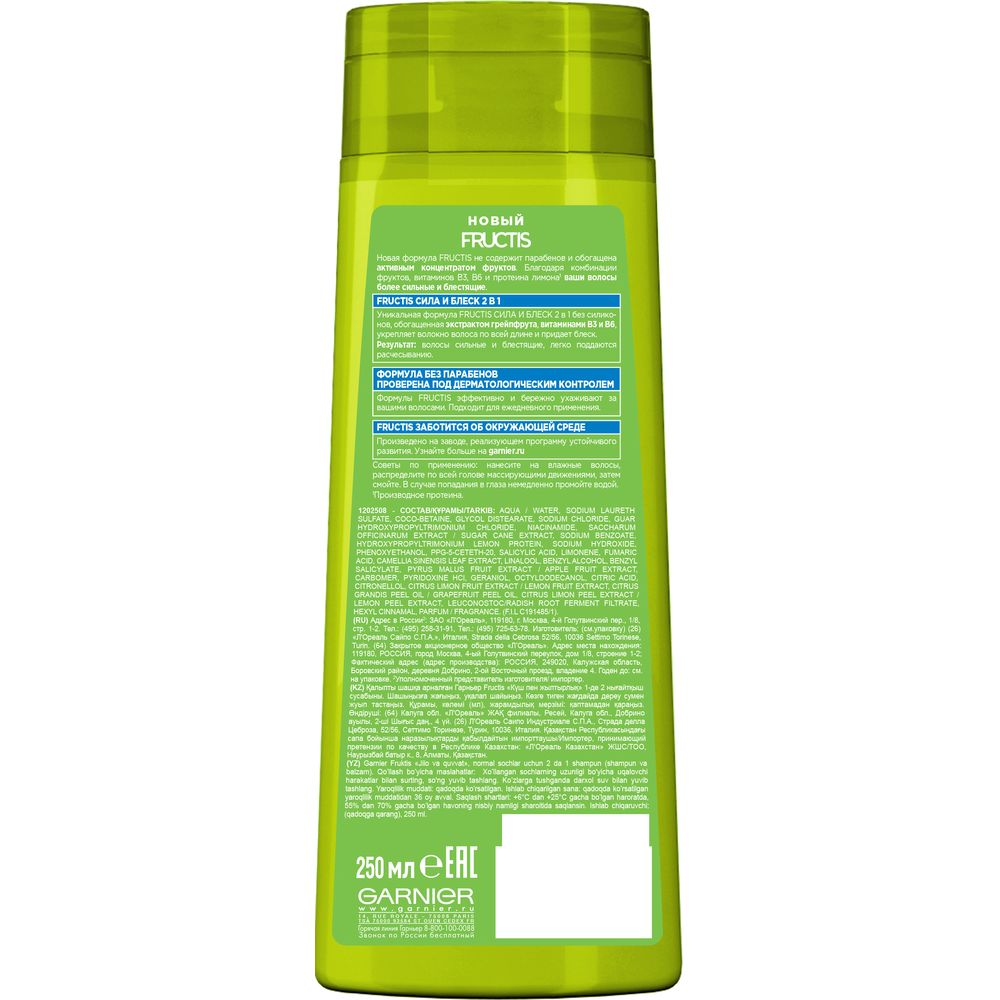 Garnier Fructis Шампунь для волос, "Фруктис, Сила и Блеск 2в1", укрепляющий, для нормальных волос, 250 мл с Экстрактом Грейпфрута