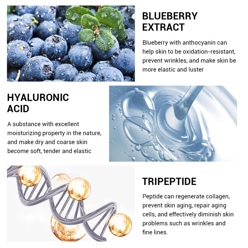 Ингредиенты: вода, bluebearry экстракт, гиалуроновая кислота, убихинон, 1,2-Hexanediol, пальмитоил Pentapeptide-4,Vaccinium узколистного, ксантановая камедь, динатриевая соль этилендиаминтетрауксусной кислоты, 1,3-бутилена пропилена гликоль, гидрированный лецитин, пальмитоил Tripeptide-1, духи