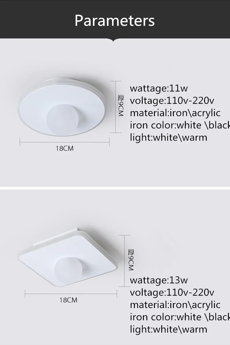 Feature High quality metal and acrylic Modern and simple style design Suitable for Aisle, corridor, dining room, bedroom, stairs, bedside, art show room ,etc. Note: Please allow 1-3cm measuring deviation due to manual measurement. Specifications Item :Ceiling light Ceiling lamp Light Source: Led stripes Size:dia18cm \ L18 x W 18cm wattage:11w(round) 13w(rectangle) voltage:110V-220V Height: 9cm Body Color:Black/White shape:round \ square Packing contents: 1 pcs x ceiling light