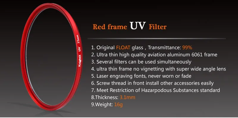 УФ-фильтр Ультра-тонкие фильтры серии MCUV применяют специальную технологию двустороннего, мульти-покрытия, линзы используют высококачественное Оптическое стекло, Который assurВысокий коэффициент пропускания и очень гладкая поверхность, что позволяет избежать ненужного отражения.