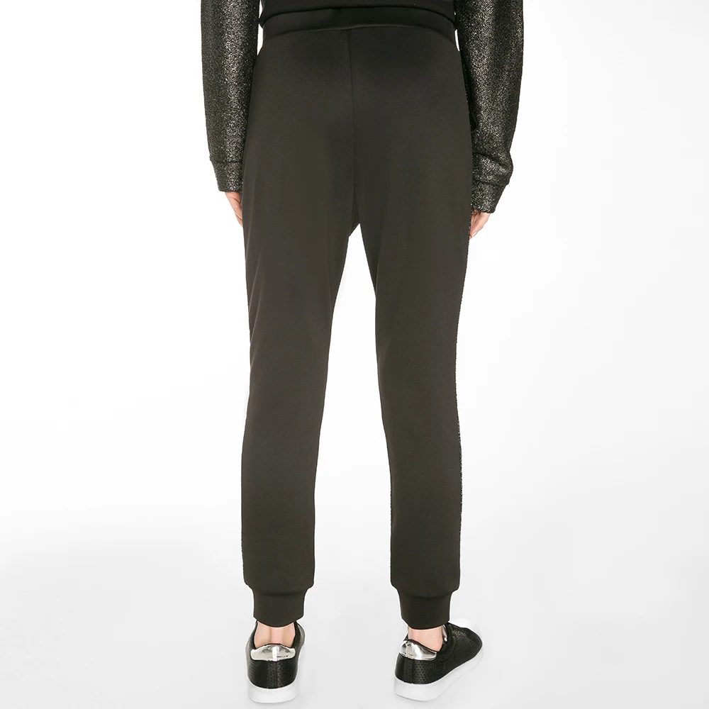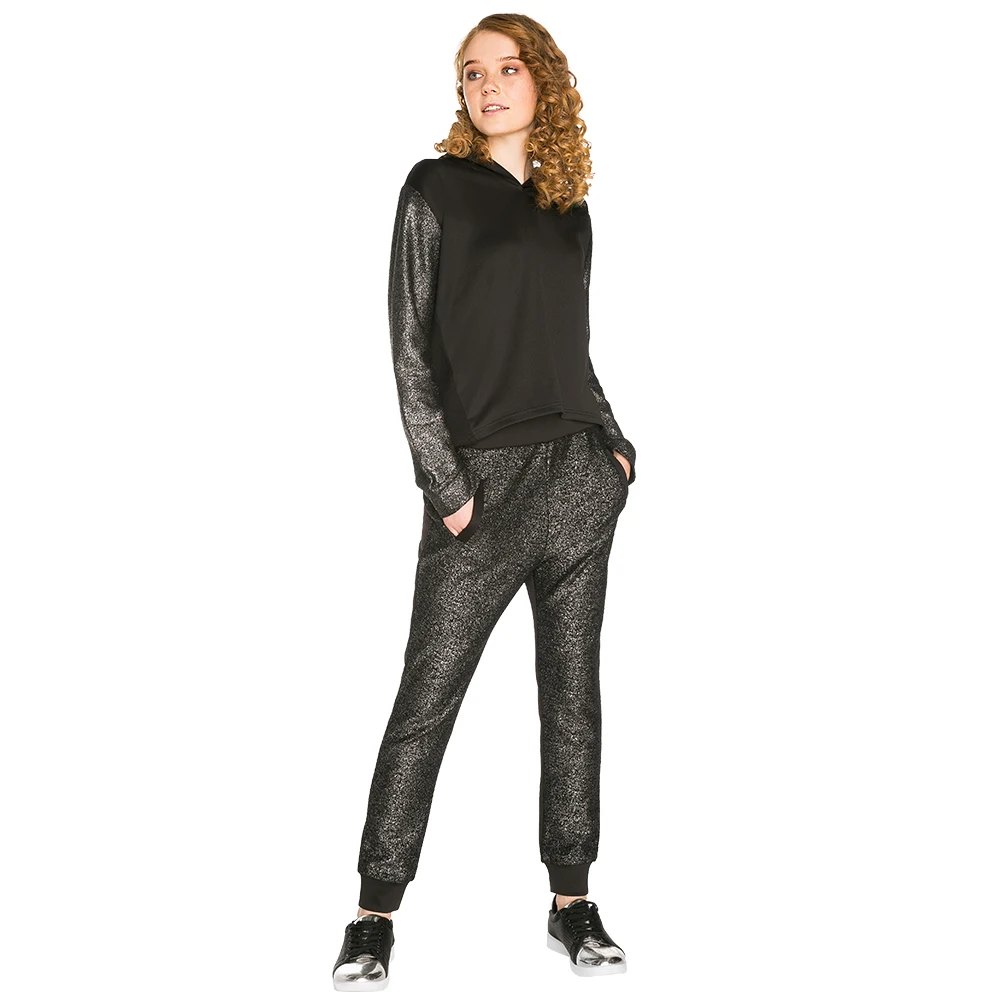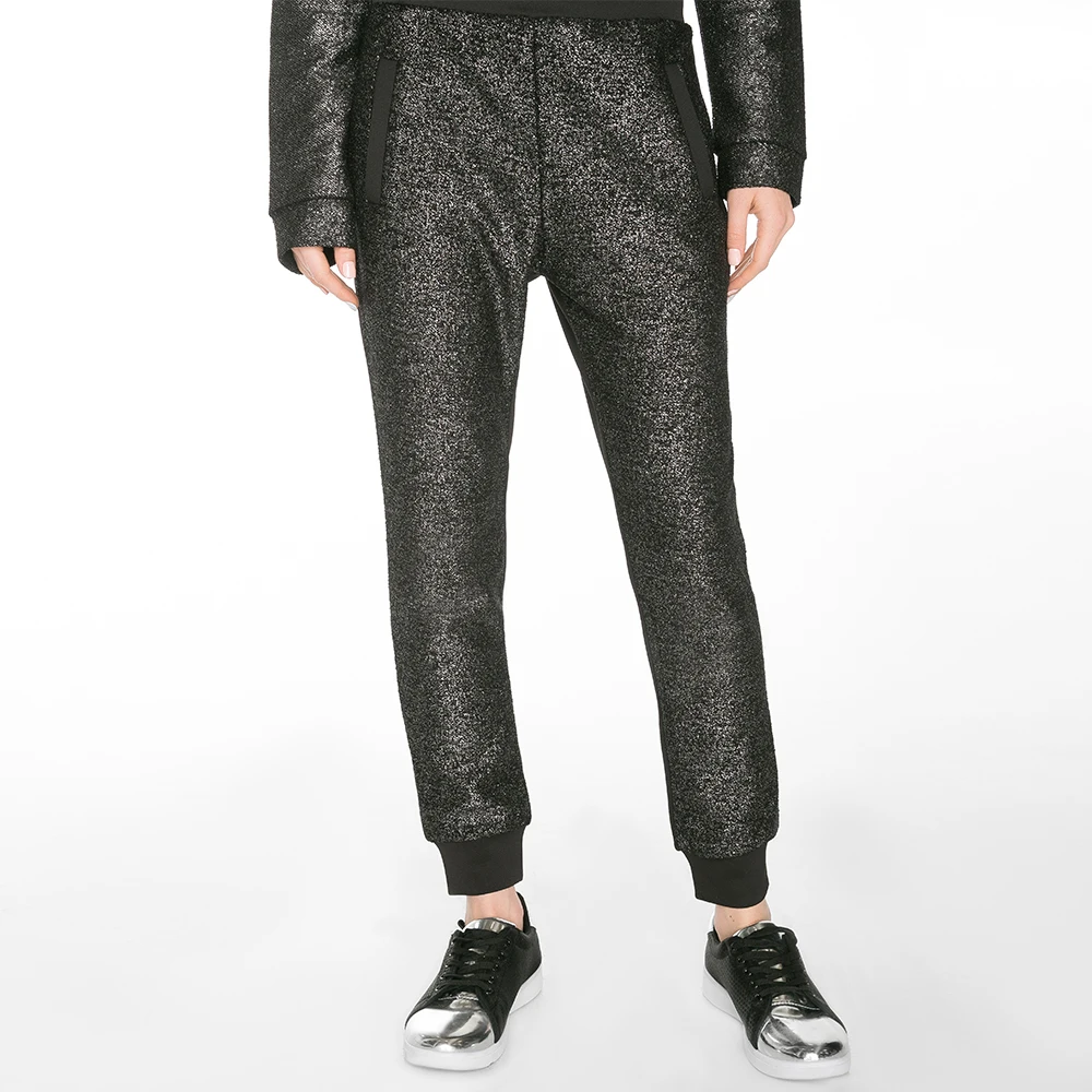 Свободный фасон и легкая дышащая ткань, регулирующийся эластичный пояс на шнурке – залог невероятного комфорта, что делает брюки незаменимыми в повседневной активной жизни. Тандем из высококачественных материалов приятен к телу, легок, гигиеничен и неприхотлив в уходе. Глубокий черный оттенок в сочетании с серебристым блеском, который достигается благодаря нитям люрекса, смотрится стильно и актуально. Отличительная черта: манжеты из эластичной трикотажной резинки – они плотно охватывают щиколотки и хорошо держат форму. Брюки украшены вместительными карманами, которые выступает не только в качестве удачного декоративного штриха, но и функционального элемента. Образ в стиле Sport Chic: брюки плюс свитшот в тон и универсальные темные кеды на контрастной подошве.