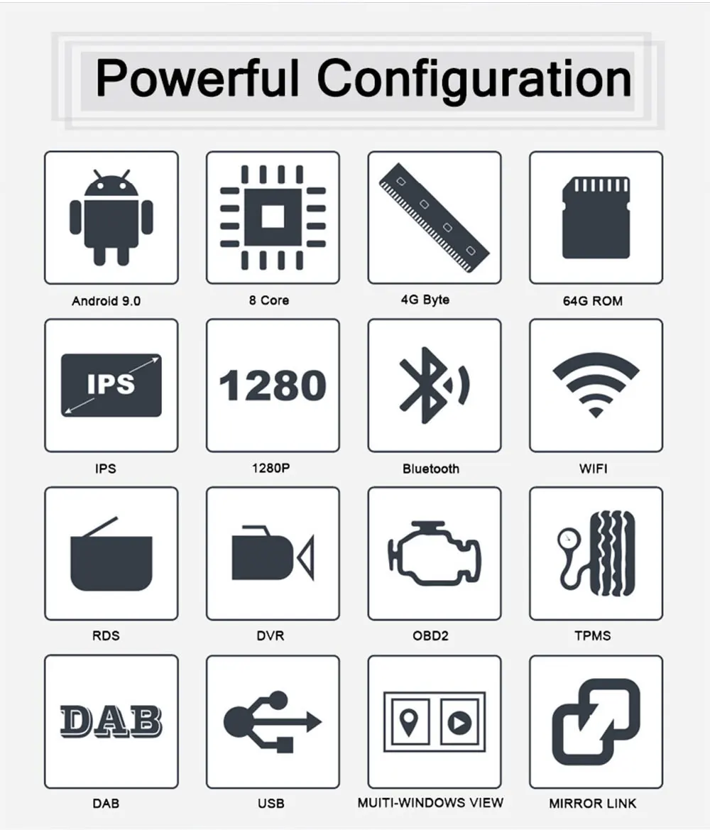 System:Android 9.0 RAM:4G ROM:64G CPU: Octa Core Touch Screen: 10.1 inch IPS Screen Resolution:1024*600 Function: DIY wallpaper from Gallery Pictures OSD Language:it has more than 70 kinds of languages to select Built-in WiFi Modem, Include 4G Modem,Support 4G/Mobile Phone WIFI hotspots. DIY Main Menu Display: You can drag Search Bar, Weather Forecast widgets, Music/Radio/BT-Stereo Player,Apps or other Bookmarks on main menu to display Built-in Mirror link. It can connect with Iphone via Wifi hotspots and connect with Android mobile phone via USB data cable and Wifi Hotspot. The mobile phone image will display on DVD, also music, video, game. For Android mobile, the DVD touch screen can control the mobile.(Please note: It can support a part of Android mobile not all of them) Support Google Maps online Navigating, Support various Android navigation software including Sygic/IGO 8, and etc Support Android Multimedia Player, it can play Music/Movie/Photo from local Disc or connected TF Card. Online Entertainment, support online video, TV, movie, music, radio, Youtube, Yahoo, MSN... Online Communication, keep connected through WeChat, Twitter, Facebook, Gtalk, Gmail and other services Support read and edit Official Software, WORD/EXCEL/POWERPOINT/PDF/TXT. Support Google Play Store, you can download thousands of Apps from here and you can down many popular games like Fruit Ninja, Feed the Candy, Angry Birds, Fieldrunner, speed forge 3D. Support Games app, HD Video, 1080P, H.264, DIVX Live images Formats Support Bluetooth hands-free function, built-in microphone Download phone book function, you can download contact information from your phone to this unit Support the newest Phone Book Search, you can search&find a contact member in downloaded phone book,just input the first letter of name, you will find some associated names, then you can choose the right one. Support Car DVR System, just connect with a USB Camera to use Car Record function. the records will be saved in GPS card automatically, and you can play saved record on this unit directly. Support DVB-T T2/MPEG2/MPEG4/ISDB-T Box input (TV box isn't included) Support Steering Wheel Control, With this function, you can intently focus on the driving and choose your favorite music safely on the move. (This function can only work with the car which supports analog signal) Support Carplay Support video input and output Support OBD Turque Function. you can connect OBD Dongle(Not included). Combined with vehicle detection software that can read car each sensor date, real-time detection auto state, providing real-time valid reference data for traffic safety. Support Europe Digital Audio Broadcasting(DAB), you have to buy a USB receiver and antenna from us. Only work in Europe area Packing List: Car Radio*1 Power Cable*1 Reverse Cable*1 RCA Cable*1 GPS Antenna*1 4G Modem*1 4G Antenna*1 USB Cable*2