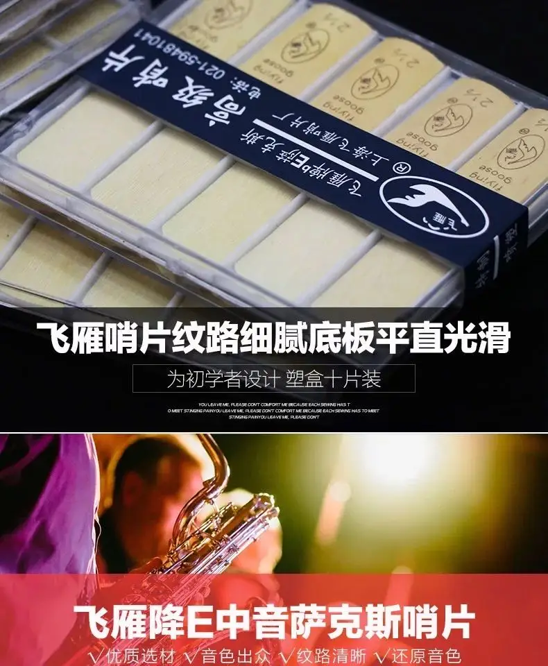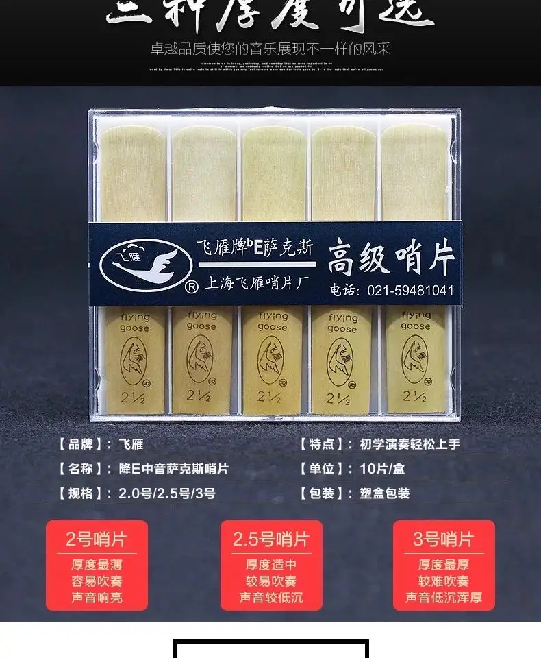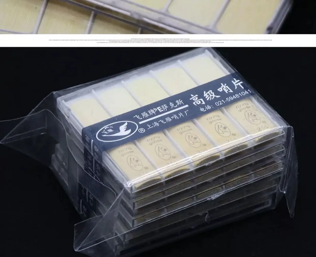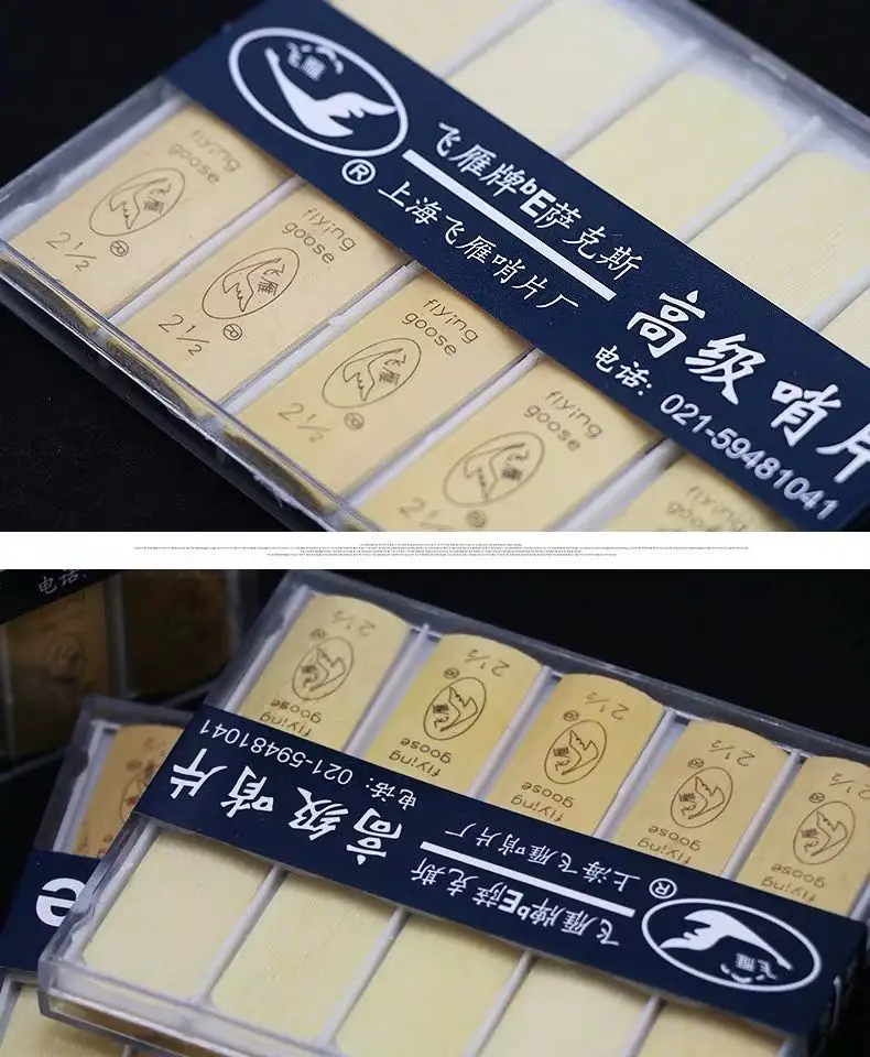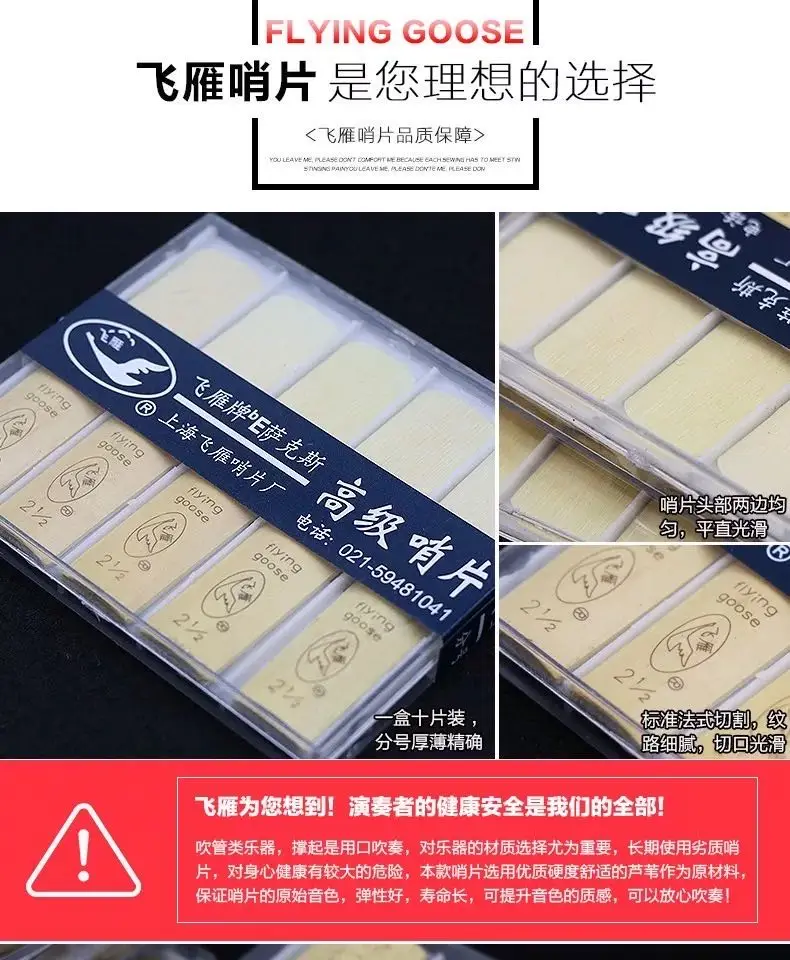 Бренд Shanghai FlyingGoose был основан в 1985 году. Эти трости немного тонки, чем вандоран и более яркие и широкие, чем Вандорен. Этот продукт легче контролировать и делать звук, полезно развивать хорошее положение рта, которое подходит для начинающих и практиковаться. (Трости этого продукта являются сырьем промежуточного уровня. Наша синяя коробка Тростников выбрать высокого качества сырья растут в течение 2 лет.) Некоторые другие трости печати xinzhong и JMreed на спине оба используют только годовое сырье. Они имеют почти тростники, которые растут только в течение 1 года, потому что они урожай в дикой природе. Сырьевые материалы, которые растут в течение 1 года, не являются зрелыми и неквалифицированными. Две коробки Пластиковые зажимы для Тростников одинаковые. Разница только в том, что подано и не подано. И одна печать синьчжун, другая печать JMreed. Сущность не отличается. Их тростники являются продуктом 'three no''. В коробке нет подробной информации. Наша цена на тростниковый продукт дешевая и качество намного лучше. Приятно познакомиться! Мой друг!(● ''d' ●)