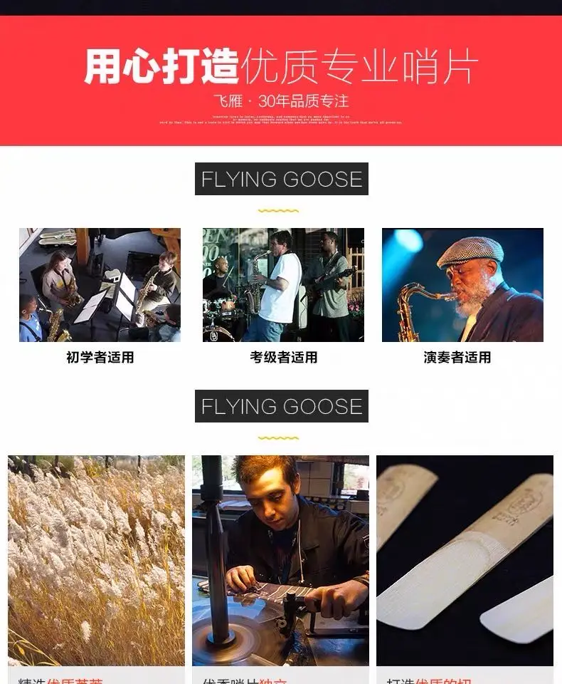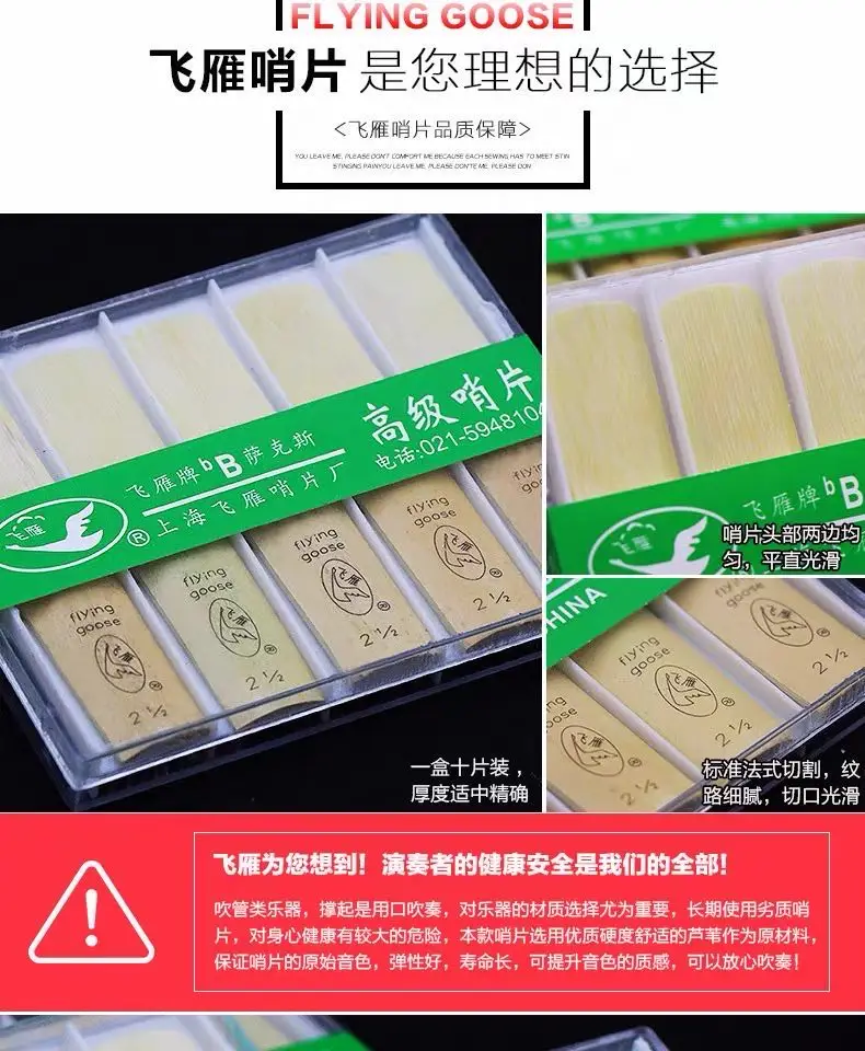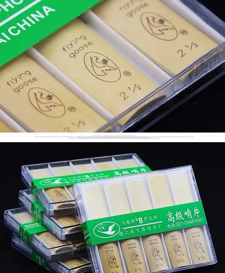 Бренд Shanghai FlyingGoose был основан в 1985 году. Эти трости немного тонки, чем вандоран и более яркие и широкие, чем Вандорен. Этот продукт легче контролировать и делать звук, полезно развивать хорошее положение рта, которое подходит для начинающих и практиковаться. (Трости этого продукта являются сырьем промежуточного уровня. Наша синяя коробка Тростников выбрать высокого качества сырья растут в течение 2 лет.) Некоторые другие трости печати xinzhong и JMreed на спине оба используют только годовое сырье. Они имеют почти тростники, которые растут только в течение 1 года, потому что они урожай в дикой природе. Сырьевые материалы, которые растут в течение 1 года, не являются зрелыми и неквалифицированными. Две коробки Пластиковые зажимы для Тростников одинаковые. Разница только в том, что подано и не подано. И одна печать синьчжун, другая печать JMreed. Сущность не отличается. Их тростники являются продуктом 'three no''. В коробке нет подробной информации. Наша цена на тростниковый продукт дешевая и качество намного лучше. Был рад познакомиться с вами! Мой друг!(● ''d' ●)