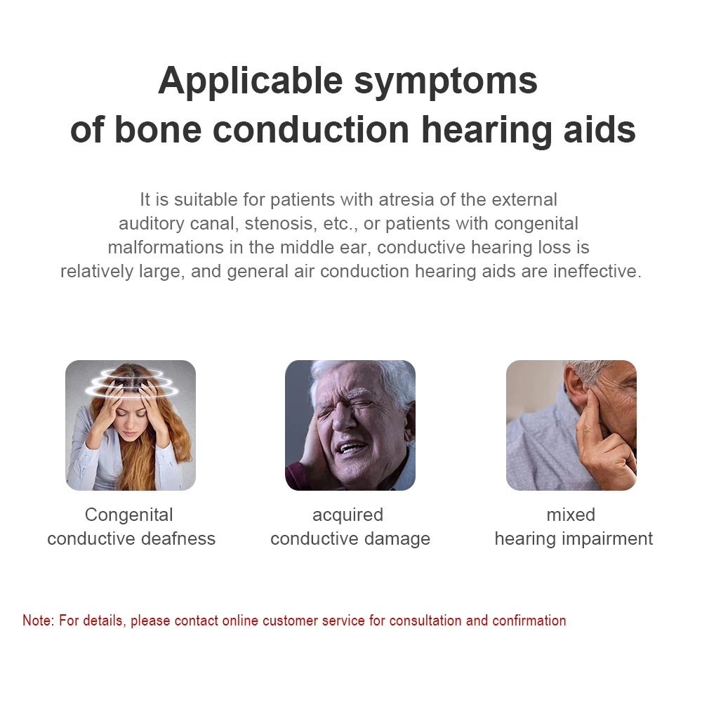 Область применения:Он подходит для пациентов с атрезией и стенозом наружных ушных каналов, или пациентов с врожденными пороками развития среднего уха, хроническими суперативными отитами, повторяющимися проводящими потерями слуха и обычными слуховыми аппаратами.Производительность продукта:Максимальный OSPL90: 118 дБ