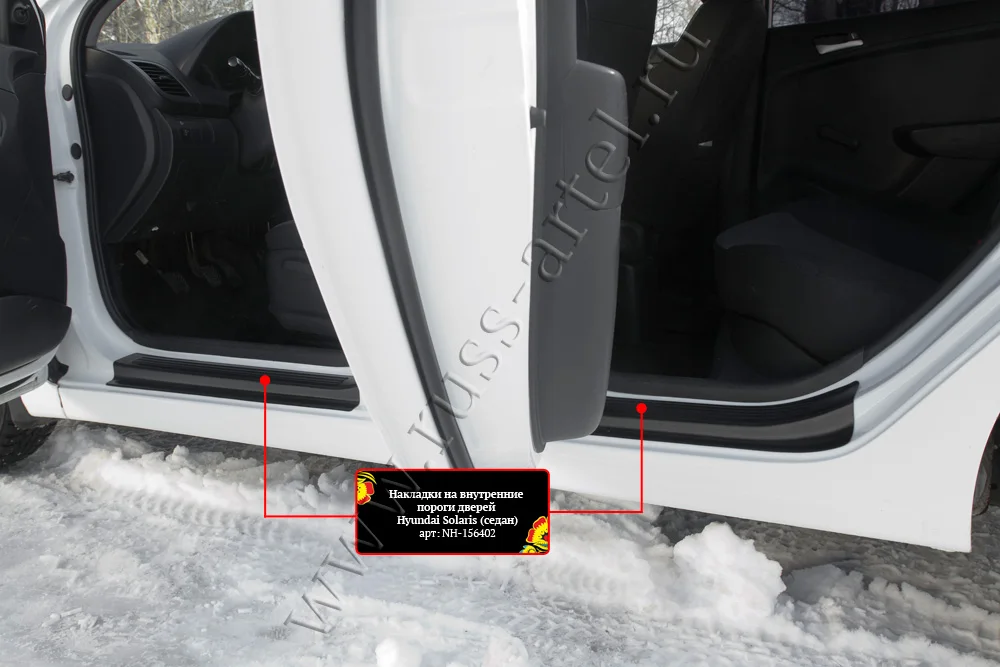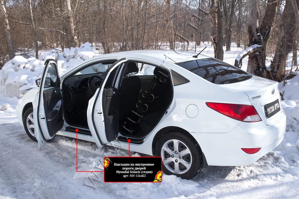 Полный комплект поставки накладок на внутренние пороги дверей автомобиля Hyundai Solaris седан 2010-2016 года выпуска включает в себя следующие элементы: накладки из АБС-пластика 4 штуки, двусторонний скотч 3М, инструкция по установке.
