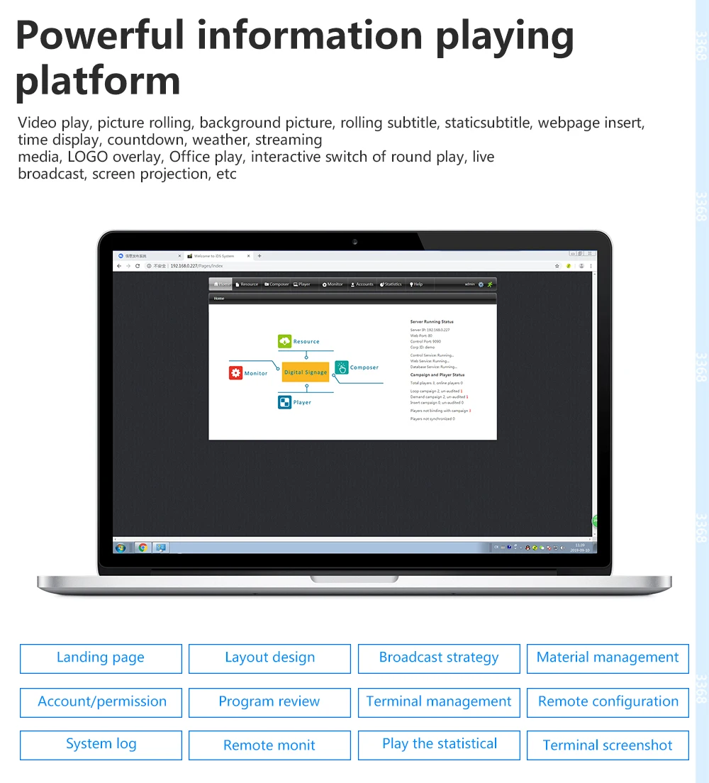 2) Центр управления: он состоит из B / S сервера и рабочей станции оборудования, управлять пользователем Логин информацию, содержание и оборудование всей системы, аранжирует различные источники информации, контролирует и контролирует терминальное оборудование. Централизованный режим дистанционного управления используется для управления клеммами дисплея в каждой области. Можно управлять ip-терминалом дисплея, а также осуществлять групповое или одноточечное управление.