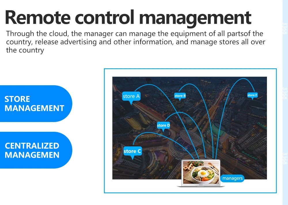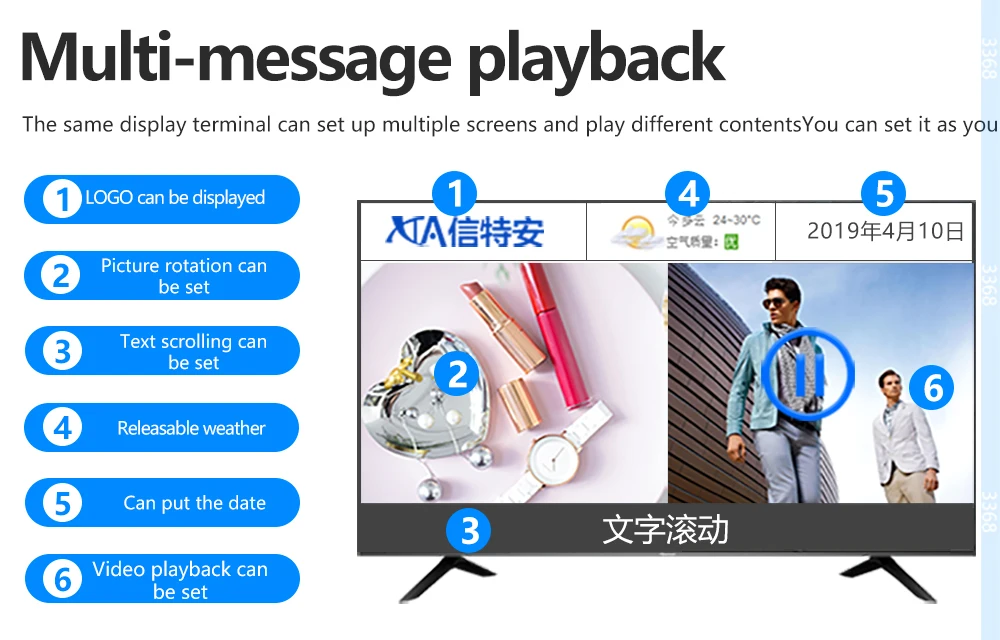 3) дисплей терминала: дисплей терминала в основном включает контроллеры, передатчики и различные Дисплейные устройства. Он принимает и выполняет мультимедийную информацию и элементы управления, контролируемые центром. Он автоматически транслируется в соответствии с расписанием через программное обеспечение терминала. Терминальный дисплей может создавать унифицированную информационную платформу на основе различных устройств отображения, таких как ЭЛТ-дисплеи, жидкокристаллические дисплеи, плазменные экраны, проекторы, сенсорные машины и все-в-одном.