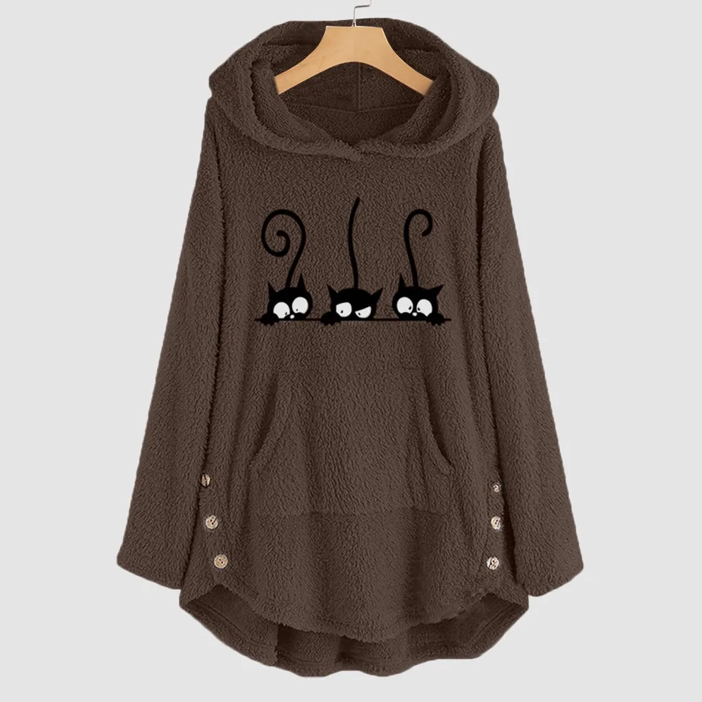 Женская флисовая кофта с вышивкой кота размера плюс, теплая толстовка на пуговицах