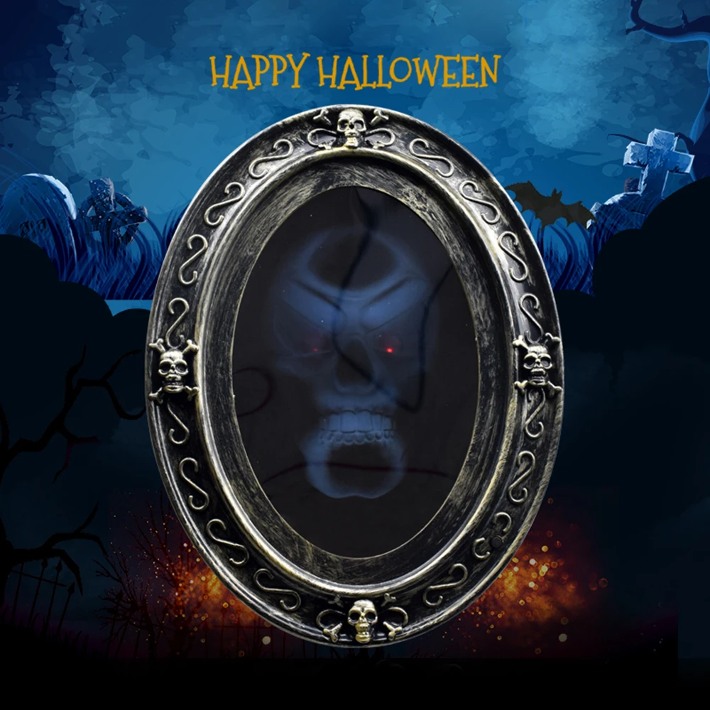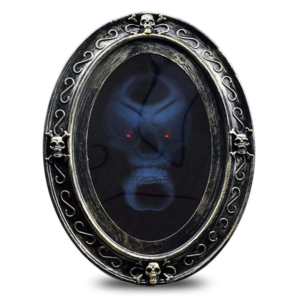 3D зеркальная голограмма с страшными звуками. При активации лица загорается и произносит страшные фразы. Удивите своих друзей этой страшной реквизитацией на Хэллоуин. Страшный человек-призрак из мигает череп и разговаривает.