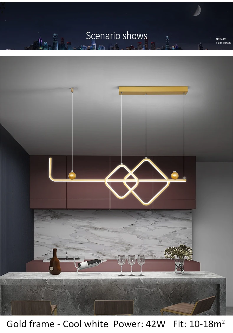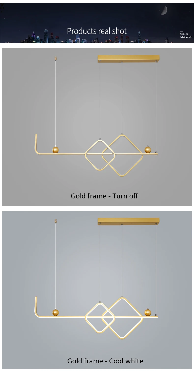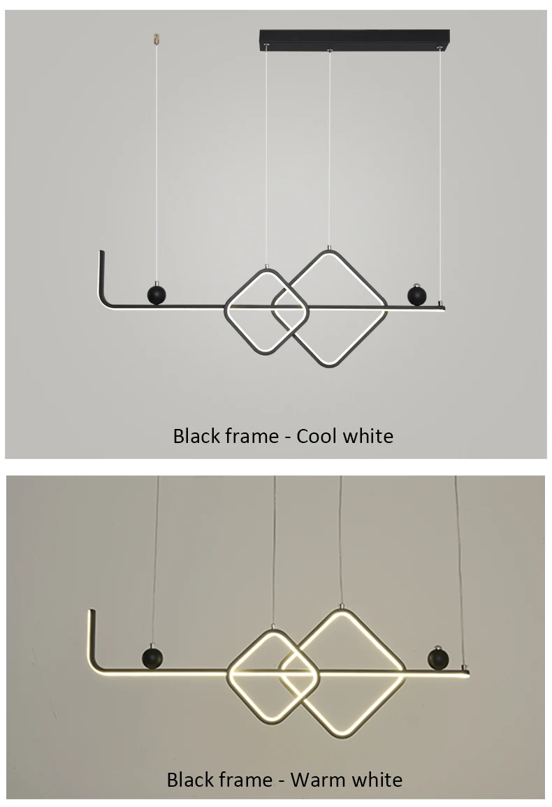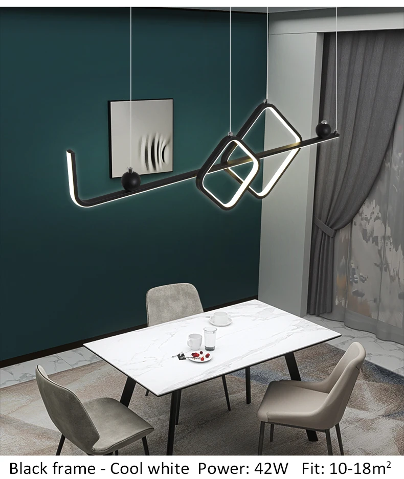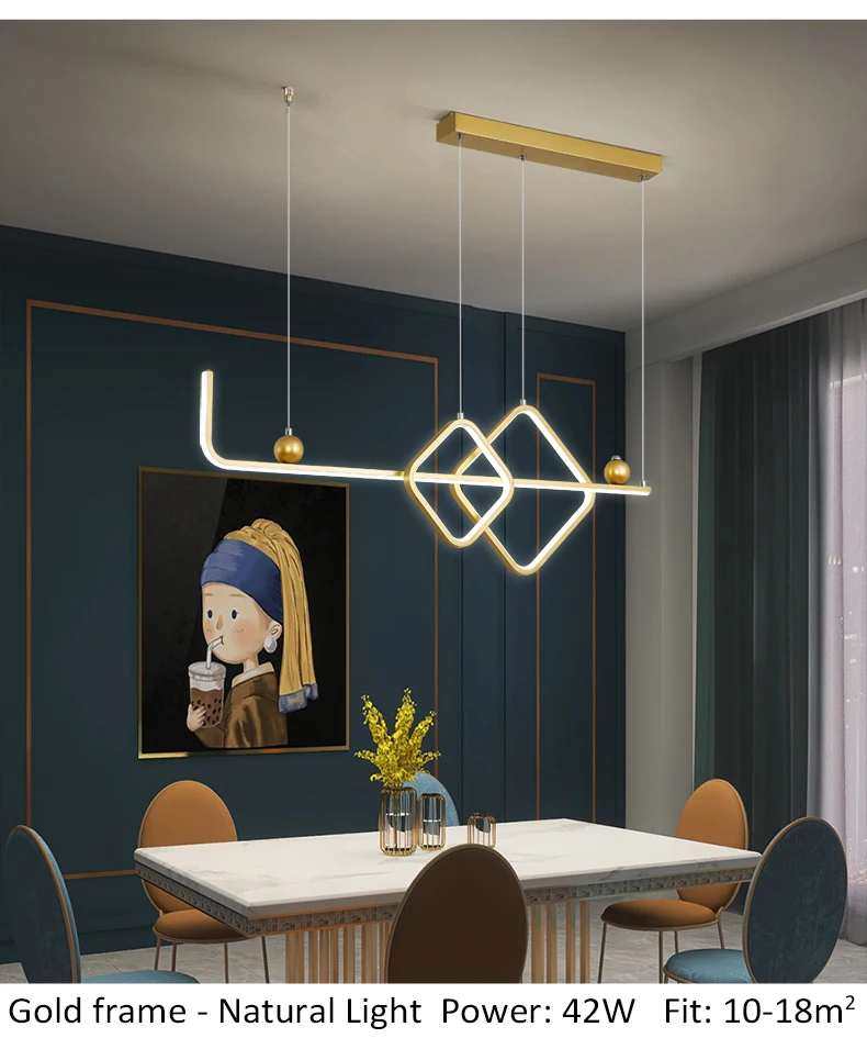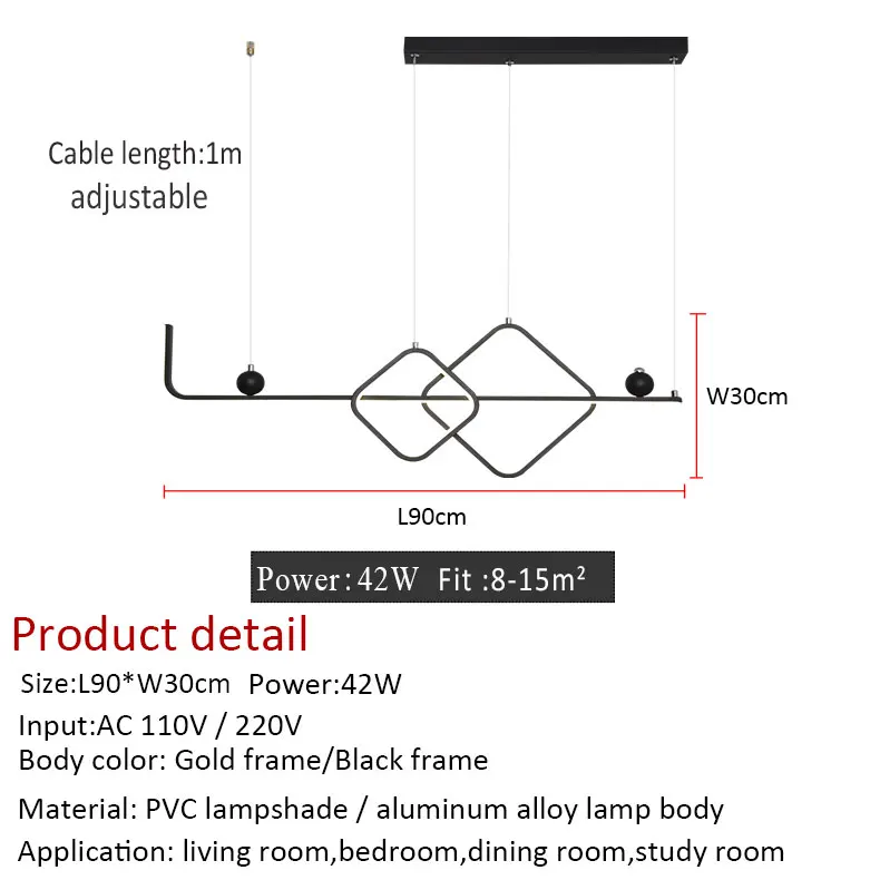 1. Цвет корпуса: черная оправа/Золотая оправа 2. Материал: абажур из ПВХ, металлический корпус 3. Размер: Д 90 см * Ш 30 см 4. Мощность: 42 Вт 5. Площадь: 10-15 м2 6. Применение: коридорный светильник гостиной, столовой, спальни, люстры светильник светильники 7. Длина кабеля: 1 м регулируется 8. Цвет света: теплый белый, холодный белый без пульта дистанционного управления Регулируемая яркость с пультом дистанционного управления: теплый белый, холодный Белый в одной лампе" 9. Отправка из: Китая