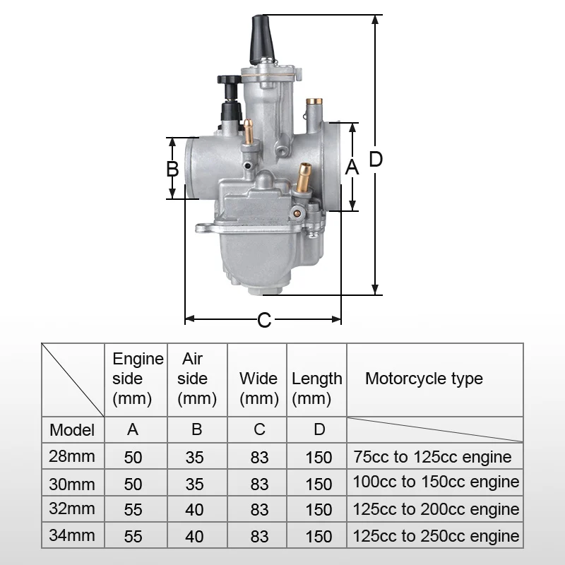 Характеристики: 100% новый, никогда не монтировался, высокое качество Материал: алюминий Цвет: как показано Размер PWK: 28 мм 30 мм 32 мм 34 мм Информация о товаре: как показано на рисунке Пожалуйста, проверьте размеры перед покупкой. Размер: 28 мм подходит для двигателя от 75 до 125 куб. См 30 мм подходит для двигателя от 100 до 150 куб. См 32 мм подходит для двигателей от 125 до 200 куб. См 34 мм подходит для двигателя от 125 до 250 куб. См Подходит для: большинства квадроциклов, мотоциклов, скутеров, Байков. Примечание: 1) Подходит для двигателей от 2T, 4T, 75 куб. См до 2/4 куб. См (универсальные двигатели с 1/цилиндрами) 2) Вы можете приобрести карбюратор на 50 куб. См выше или ниже оригинального, чтобы сэкономить газ и быстрее ездить. 3) Вы можете выбрать нужный вам размер и название тела. 4) Заменяет существующий карбюратор, просто замените и прокатитесь снова. Посылка входит: 1 карбюратор для мотоцикла Инструкция по установке не входит в комплект.