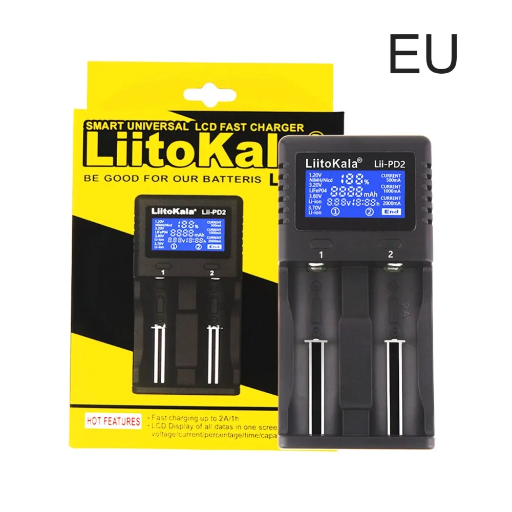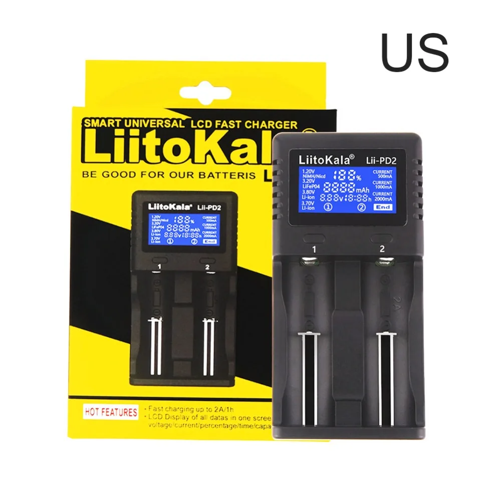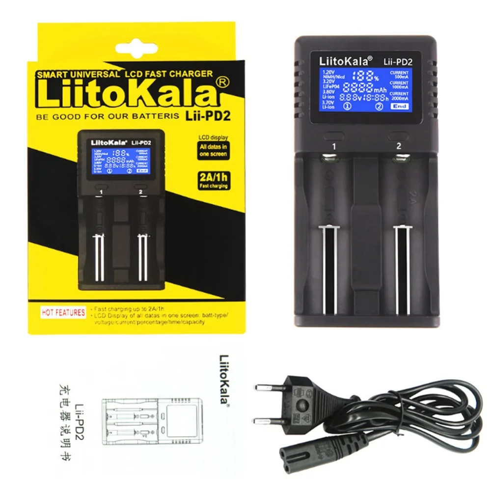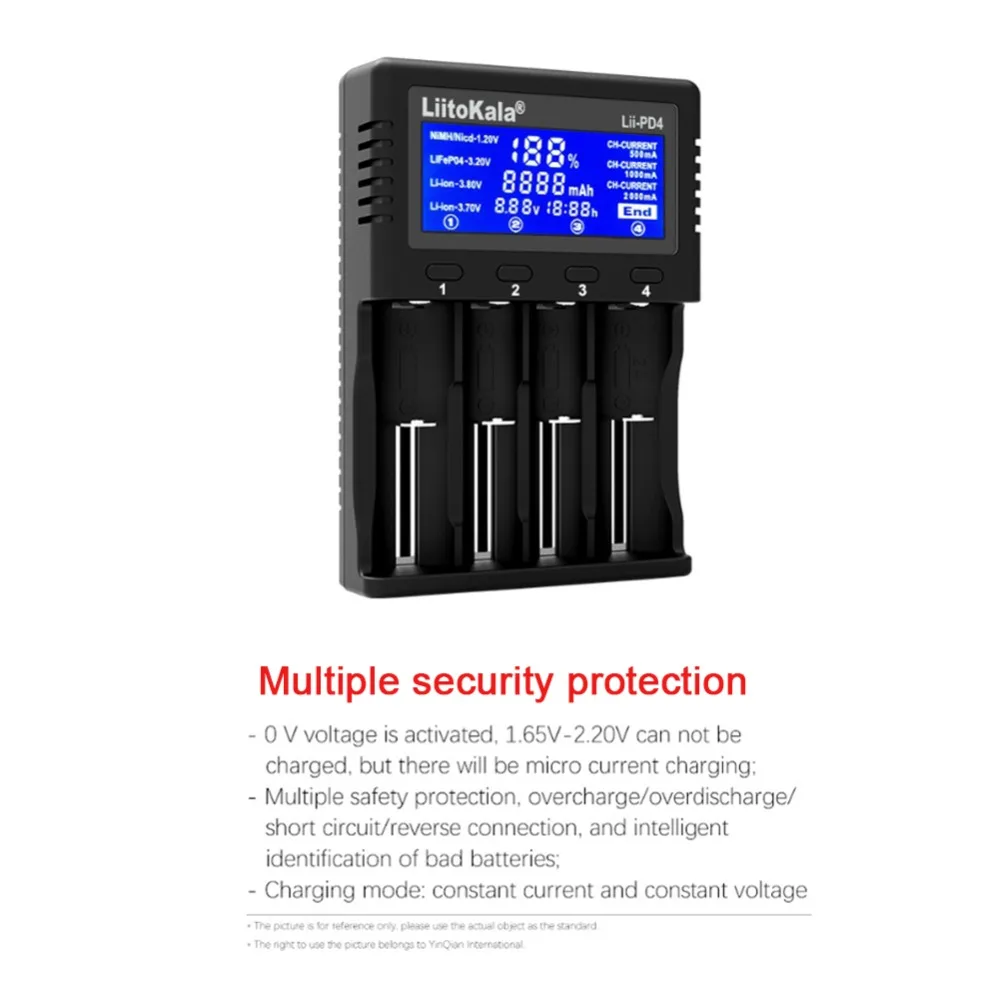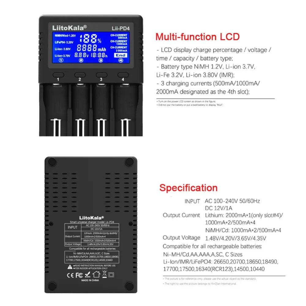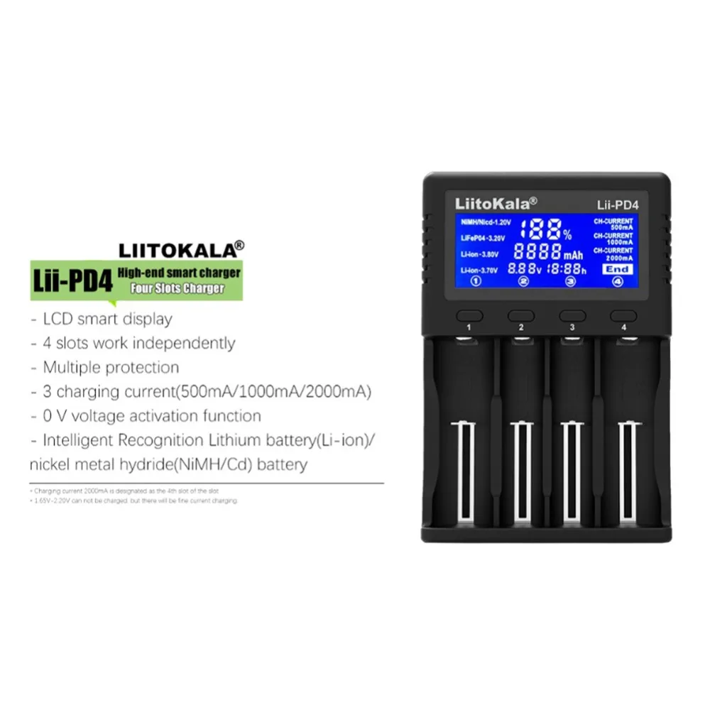 Многофункциональный ЖК-дисплей для зарядки: для хода зарядки 25% - 50% - 75% -100%, типы батарей: ni-mh 1,2 V, Li-Fe 3,2 V, Li-ion 3,7 V, li-Ion 3,80 V (IMR), емкость зарядки, напряжение и ток: 0.5A/1A/2A.