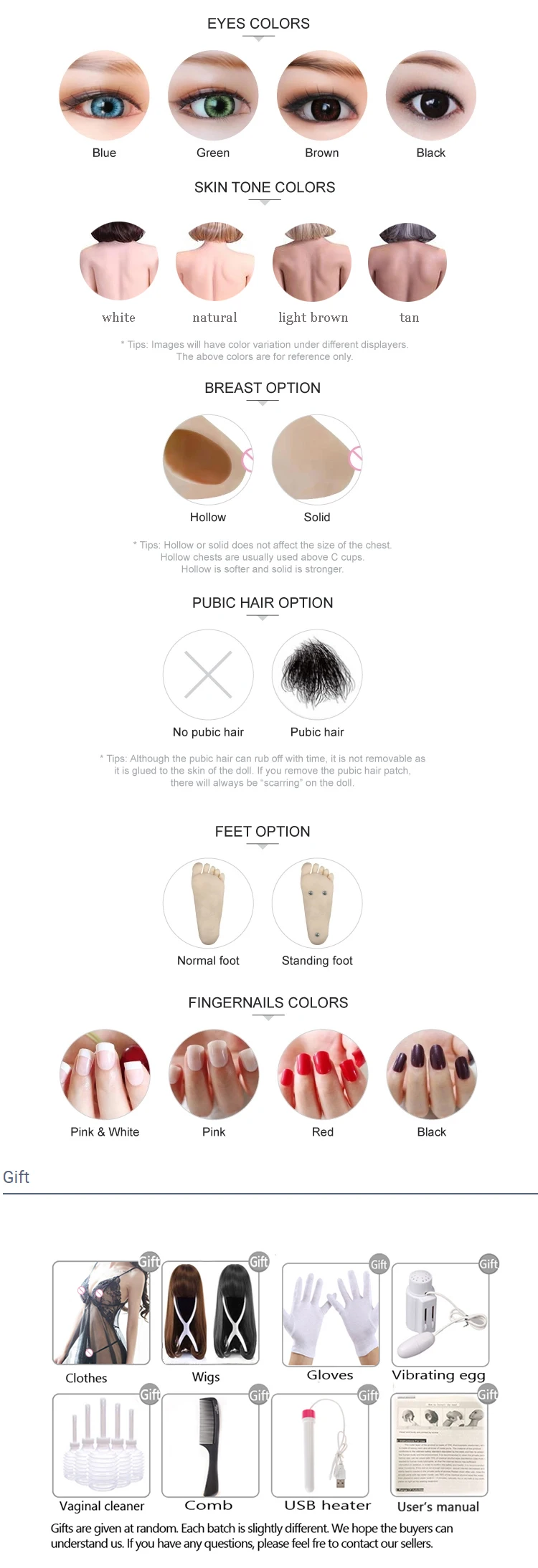 Цвет глаз, цвет кожи, пустотелая/твердая грудь, лобковые волосы или нет, стопа или нет, цвет ногтей. Если вам нужно настроить куклу, пожалуйста, оставьте сообщение на примечания к заказу.