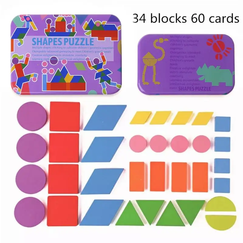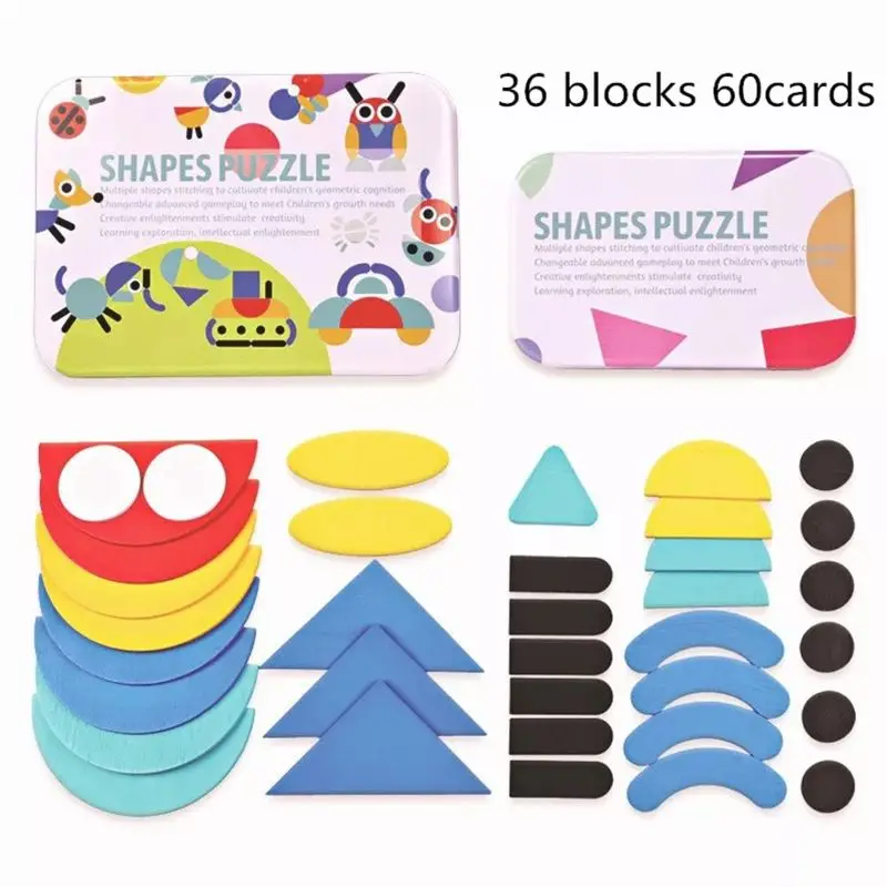 Деревянные блоки с рисунком-Набор пазлов в форме танграма, сортировка цветов, укладка, игра, дерево, животное, головоломка, дошкольник, Монтессори, мозги, шток, подарок для От 3 до 5 лет малыша (60 карточек с рисунком)