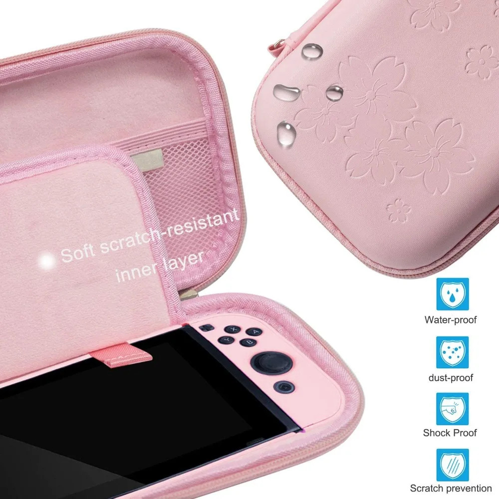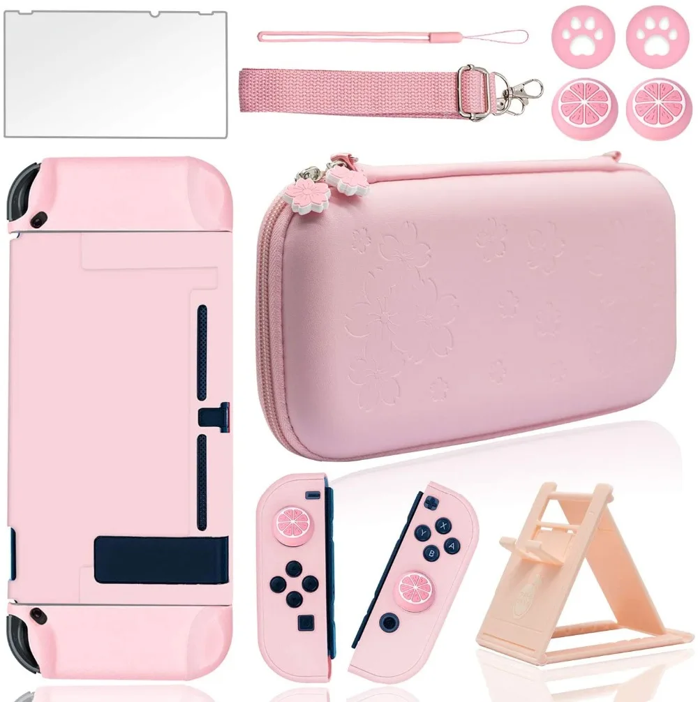 Розовый дорожный Чехол для переноски, комплект аксессуаров для Nintendo Switch с жестким защитным чехлом, Защитное стекло для экрана, ультра-тонкая Регулируемая подставка и колпачки для большого пальца 10 в 1