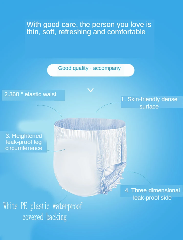 Основная особенность: 1. Белая PE пластиковая Водонепроницаемая подложка 2. Мягкий верхний лист, ткань как задний лист, чувствовать себя комфортно 3. Супер Поглощение, Блокировка воды, сохраняет кожу сухой 4. Тип брюк, легко надевать и снимать