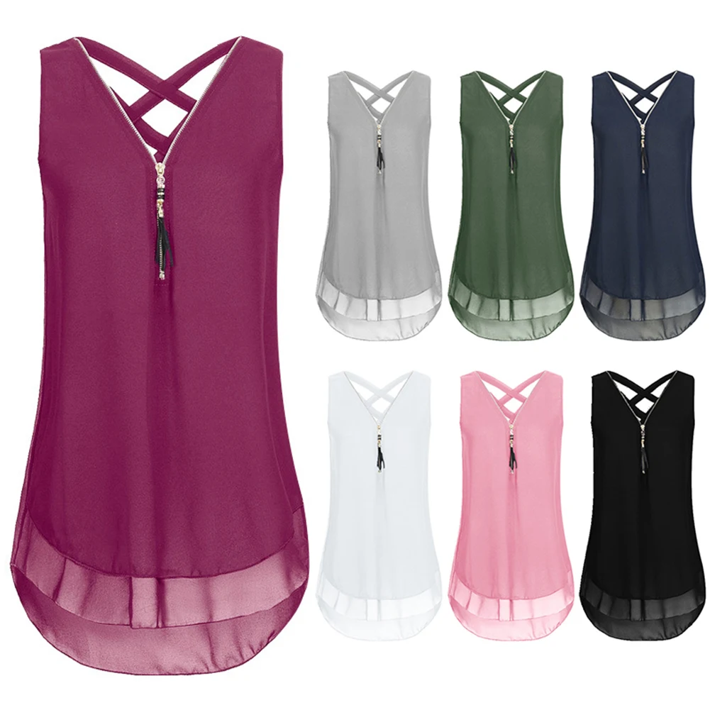 Женская однотонная шифоновая футболка на молнии без рукавов с v-образным вырезом размера плюс