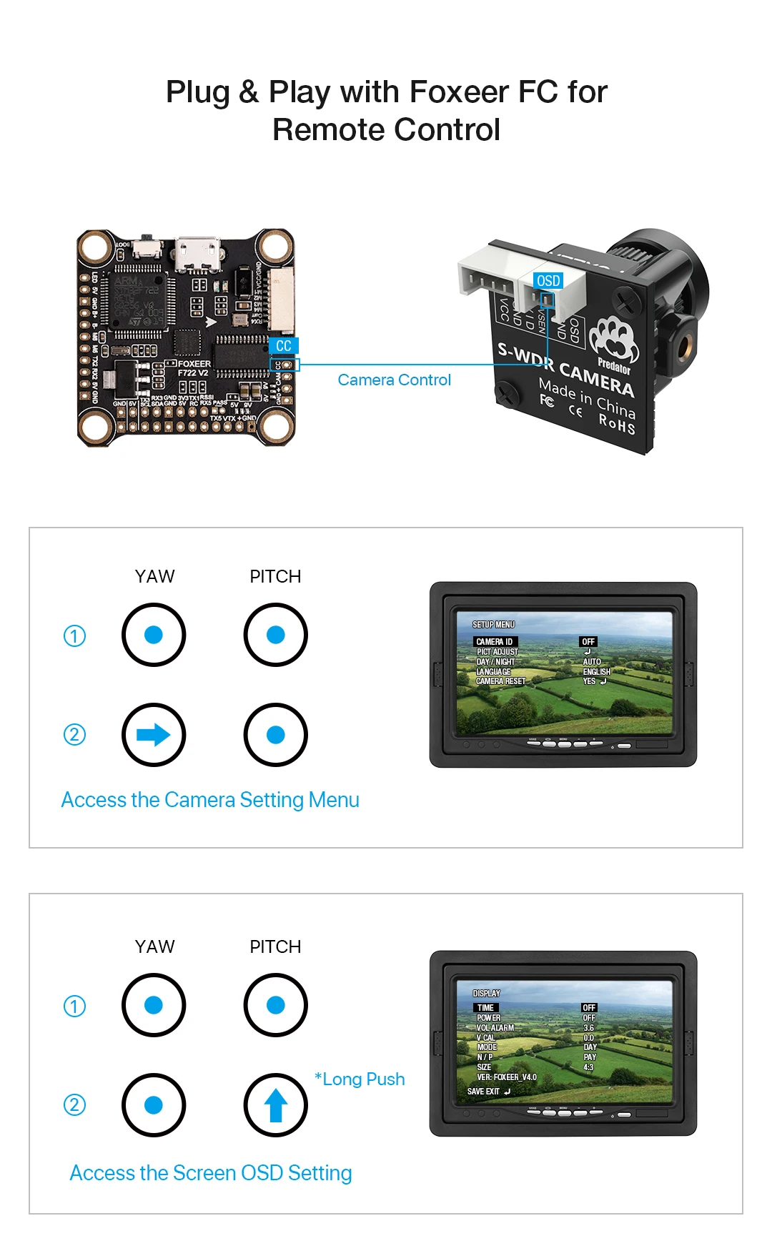 Sensor Type 1/3" CMOS Sensor Scale 4:3(default)/16:9 Switchable Tv System PAL(default)/NTSC Switchable Resolution 1000TVL Shutter Speed PAL 1/25~1/10000 sec; NTSC 1/30~1/10000 sec Video Output CVBS Analog Signal FOV FOV-H:125° FOV-D: 155° Shutter Speed Auto Minimum Illumination 0.01Lux White Balance Auto DNR 3DNR 2DNR WDR Super WDR Mode DAY/CLOUDY/Night/LED Fast Mode Switch Long Press Right Button to switch among DAY/CLOUDY/Night/LED Flight OSD Voltage/Cam Title/Time/Cross Hair Input Voltage 4.5V~20V Language ENGLISH/ DEUTSCH/ FRANCAIS/ PYCCKNN/ PORTUGUES/ ESPANOL/ chinese Working Temperature -10°~50°C RH90% MAX Working Humidity 20~80% Storage Temperature -20°~70°C Consumption 50mA±15% @ DC12V 115mA±15% @ DC5V Dimension 19*19mm Weight Naked:5.8g Full Case:6.3g(Exclude cable)
