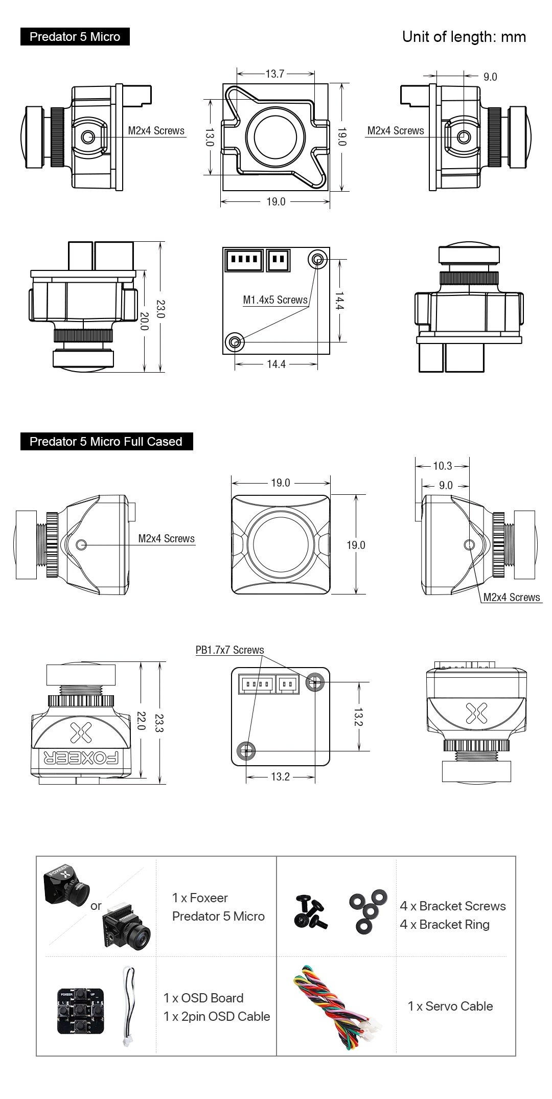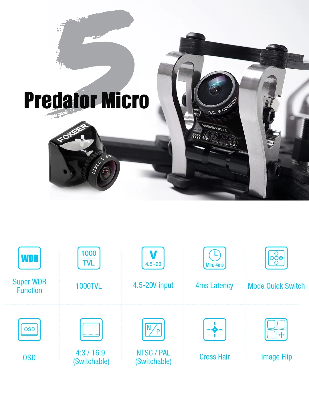 Foxeer Micro Predator 5 Racing FPV Camera 19*19mm 1000TVL 1.7mm M8 Lens 4ms Latency Super WDR - Black Full Case
