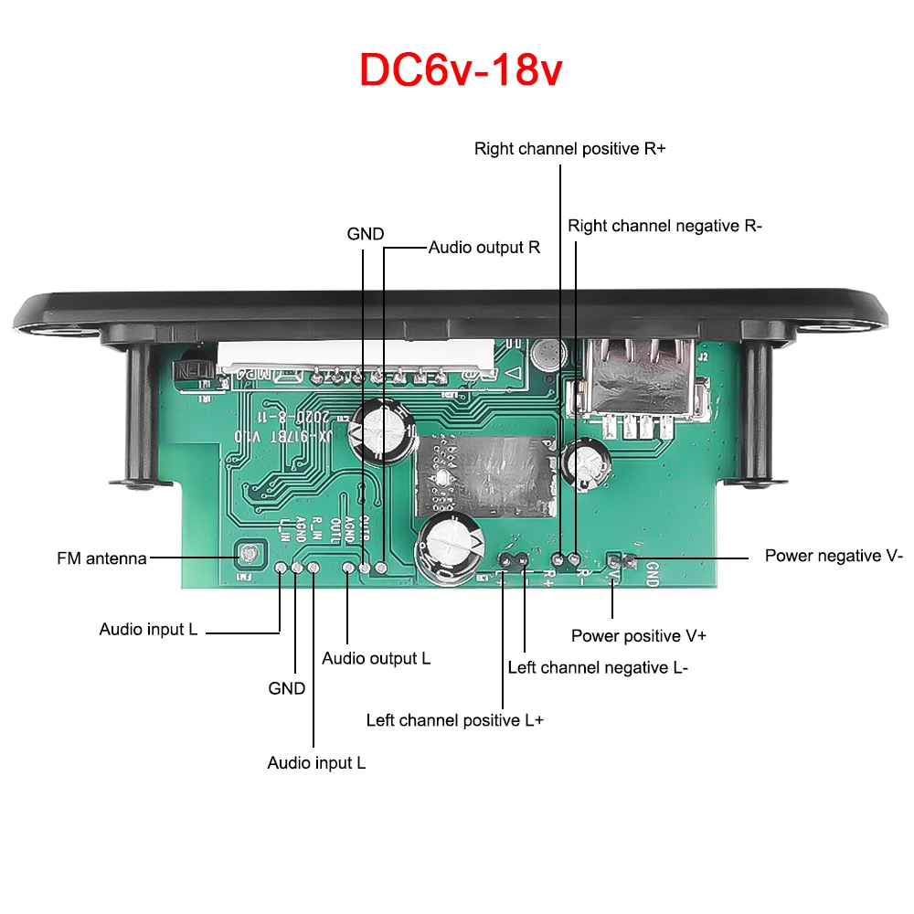 Специальная функция:1. Поддержка воспроизведения папок2. Поддержка вызова3. Поддержка записи. Запись поддерживается только в режиме TF или в режиме USB.(Нажмите и удерживайте кнопку MODE, чтобы начать запись, нажмите и удерживайте кнопку MODE еще раз, чтобы отменить запись и воспроизвести файл записи; При записи необходимо подключить устройство хранения, например, U-диск или TF-карта;)4. Поддержка отключения питания (поддержка последнего режима и объема памяти. (Последняя Настройка перед выключением питания будет воспроизведена после включения питания)5. Цветной экран6. Напряжение питания поддерживает между DC6v-18v, а ток между 1-3A.7. Может быть напрямую подключен к колонкам, с усилителем мощности и функциями декодирования.8. Поддержка форматов песен MP3 /WMA / WAV / APE / FLAC9. Основные функции MP3/USB/TF/линейный вход/FM/BLUETOOTH/пульт дистанционного управления/10. Версия Bluetooth-5,011. Мощность 6 Вт, true stereo двухканальный. (2*3 Вт)Посылка входит: