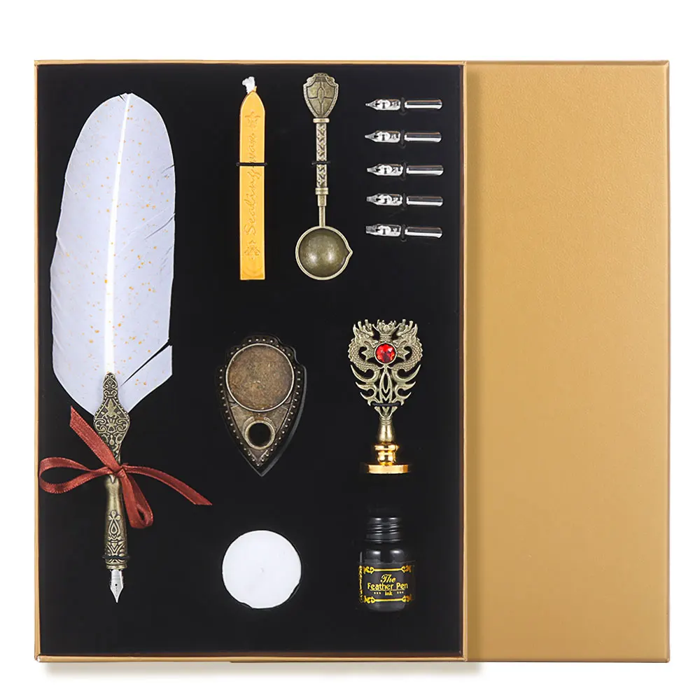 1Set Wax Seal Stamp Kit Quill Pen ink Set Feather Dip Pen Vintage Romantic Multi Function Pen Writing Tools Craft Supplies