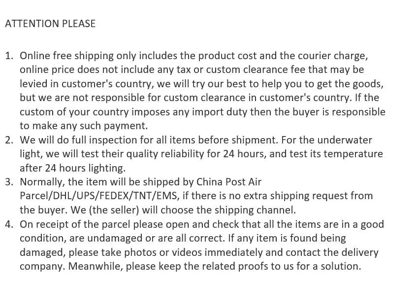 Quality: 100% of the lamps will be tested and keep lighting for 24 hours to test its quality reliability underwater, and we will also test its temperature after 24 hours lighting. Then we again test 100% of the lamps to see if it still work well after it was cool. Each lamp should pass all these QC procedures before the packing.