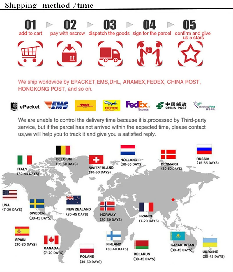 3.Наш отдел доставкиОбычно используетсяTNT , EMS , ARAMEX, около15-20ДнейДля доставки. Иногда это может привести к задержкам, будь то национальный праздник или проблемы с клиентами.Пожалуйста, будьте терпеливы для вашего товара. Пожалуйста, укажите свое полное имя, почтовый индекс, домашний или уличный адрес и номер телефона.(Южная Корея, Япония, Вьетнам, друзья, не говорящие на английском языке, отправляют DHL и Fdex express, пожалуйста, оставьте свой английский адрес, пожалуйста, обратите внимание)Более точный адрес сделает доставку более плавной. Как правило, информация об отслеживании приходит в течение 7 дней.