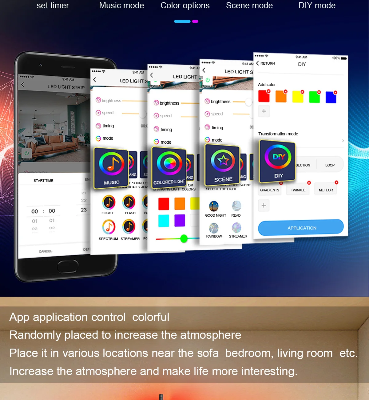 Brand NameBUYBAYModel Number01OriginMainland ChinaMaterialAluminumStyleContemporaryItem TypeFloor LampsPower SourceDCApplicationFoyerVoltage5VWattage6-10WFeaturesDIYCertificationceCertificationFCCCertificationROHSBody MaterialPVCLight SourceHIDBase TypeWedgeWarranty1 yearIs Bulbs IncludedNoIs DimmableYesNumber of light sources> 20Lighting Area5-10square metersSwitch TypeRemote ControlFinishBrushed NickelShade DirectionUp & DownShade TypeShadelessMeasurement unitpiece/piecesSold insell_by_pieceEach pack1Package weight2.200Package size - length (cm)10Package size - width (cm)10Package size - height (cm)10Products nameDIY Dimming Floor LampSize3*156.2cmColorRGB