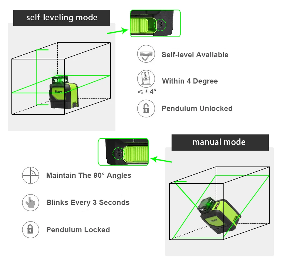 Многофункциональные режимы: одна кнопка работы делает его гораздо проще проектировать линии (ы) либо все сразу, либо независимо, когда это необходимо (поперечная линия, вертикальная и 360 градусов покрытие по горизонтали). Нажмите и удерживайте верхнюю кнопку в течение 2 секунд, чтобы активировать режим «наклон», что позволяет проецировать прямые линии в любом положении или под углом.