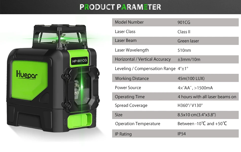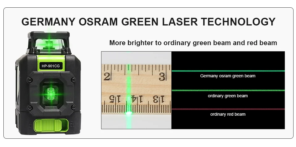 Новая технология зеленого диода-мы используем передовые технологии, сделанные в Германии, которая является лучшим зеленым лазерным блоком в настоящее время; зеленый лазерный луч в 2 раза ярче, чем красный лазер с одной и той же светильник источника. При облачности и интенсивности светильник 14000lux видимость Huepar 901 cg's составляет 50 футов.
