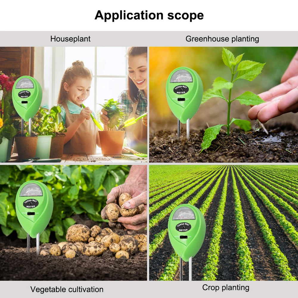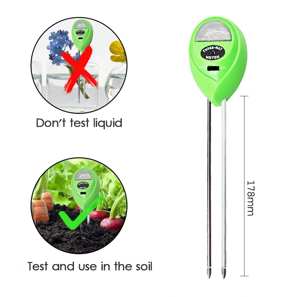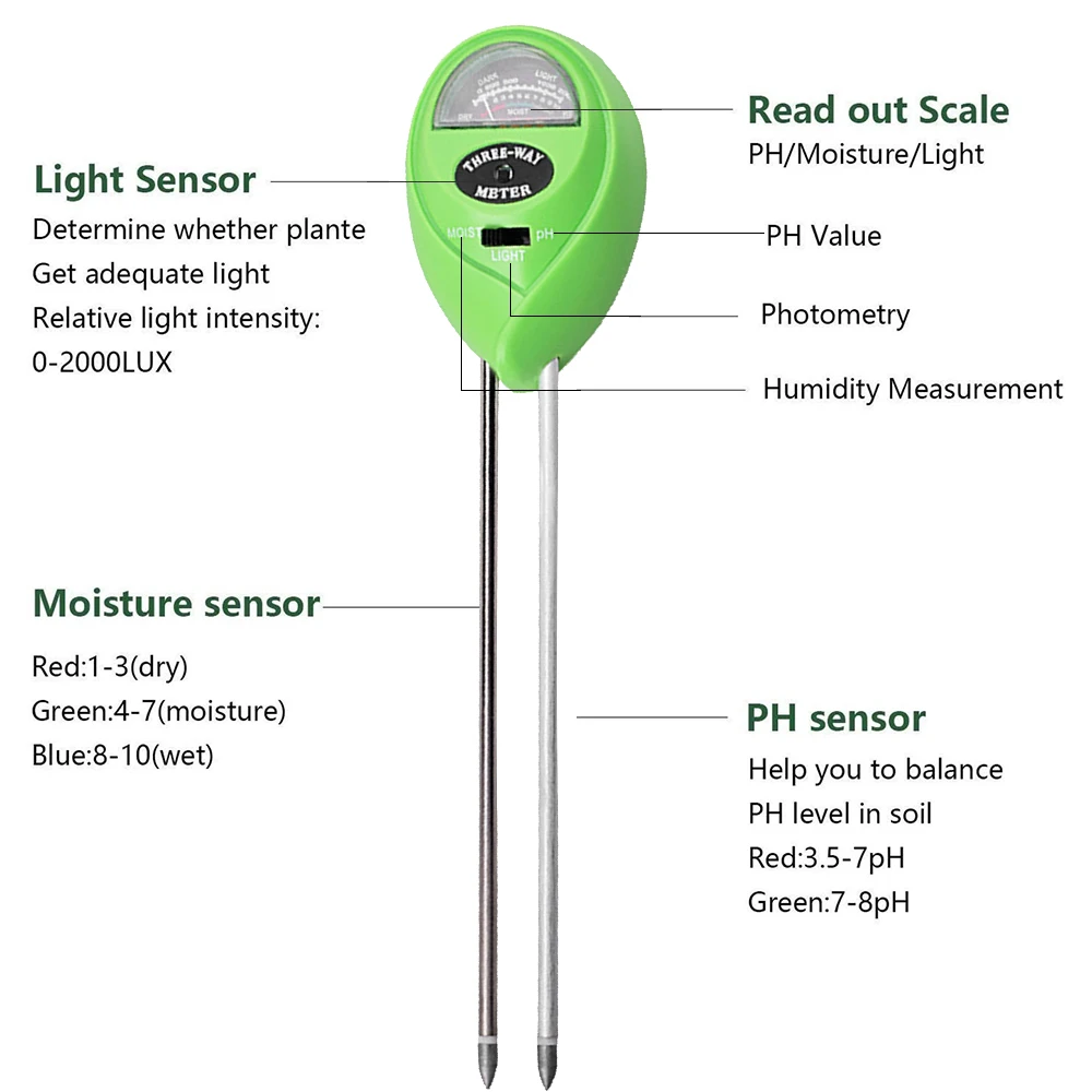 3 в 1 тестер благодаря чему вы можете измерить влажности почвы, значение рН почвы и интенсивность солнечного света растений. Это полезно для вас, чтобы контролировать полив, pH значение солнечного времени для ваших растений, чтобы помочь им расти здоровым и сильным.