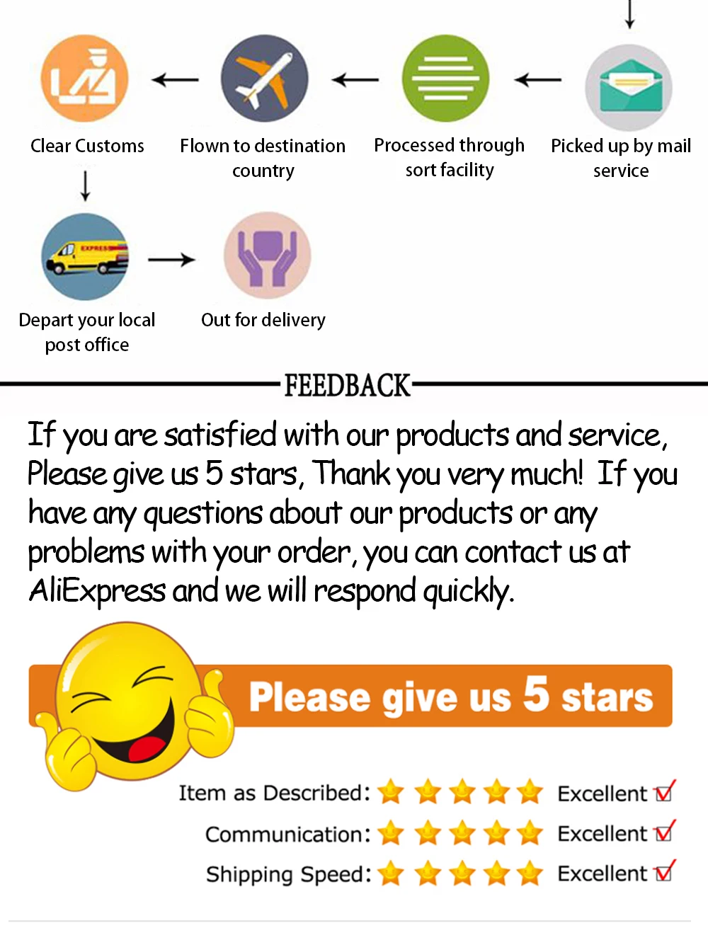 Если вы удовлетворены нашими продуктами и обслуживанием, пожалуйста, дайте нам 5 звезд, большое спасибо! Если у вас есть какие-либо вопросы о наших продуктах или какие-либо проблемы с вашим заказом, вы можете связаться с нами по AliExpress, и мы быстро ответим.