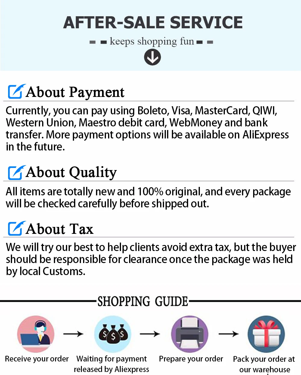 Все товары абсолютно новые и 100% оригинальные, и каждая посылка тщательно проверяется перед отправкой.