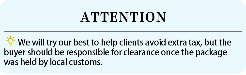 Мы постараемся сделать все возможное, чтобы помочь клиентам избежать дополнительных налогов, но покупатель должен нести ответственность за очистку, как только посылка будет удерживаться местной таможней.