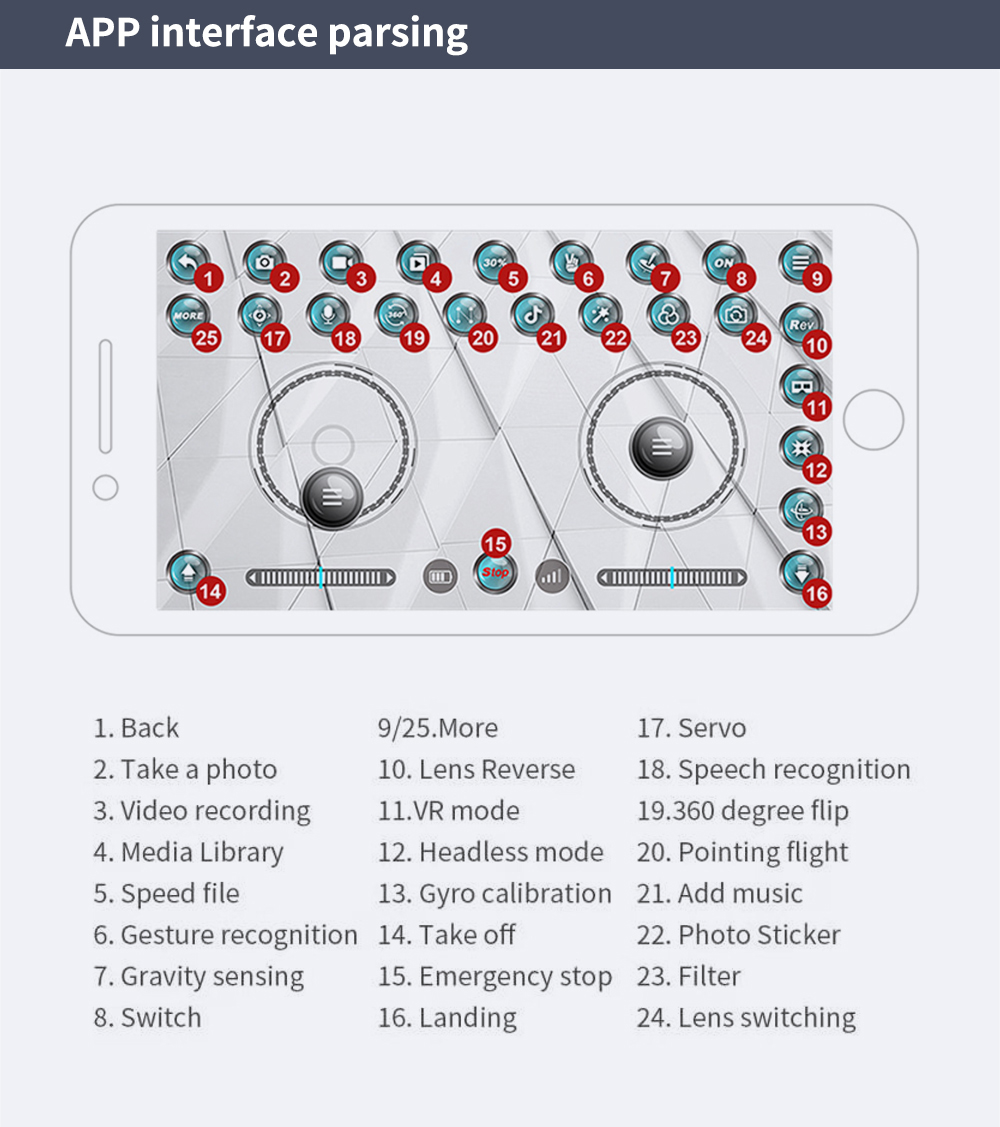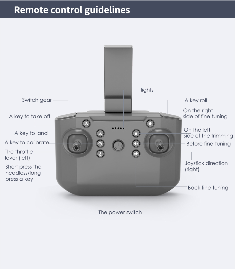 Специальная функция: подъем и спуск, левый и правый поворот, вперед, назад, левый и правый муха, быстрый и медленный контроль скорости, Безголовый режим,