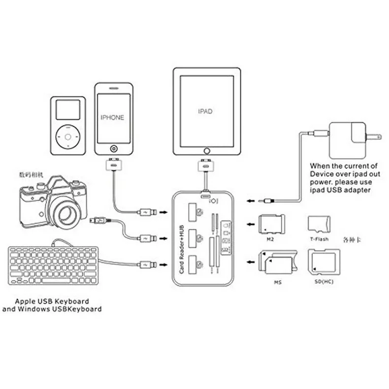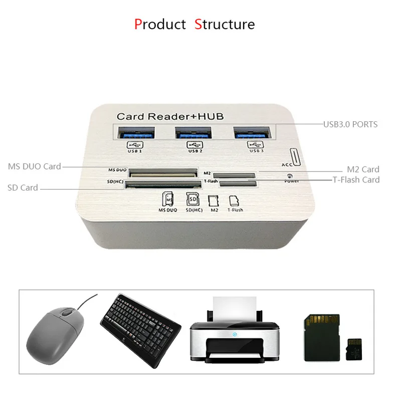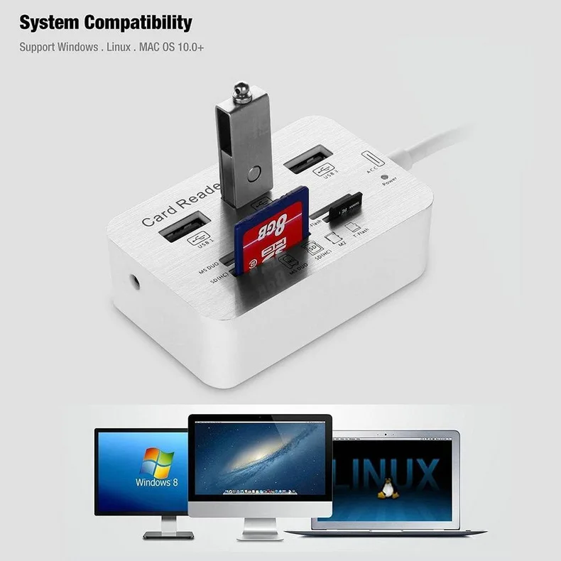Многофункциональность: считыватель карт 7 в 1, 3 * USB 3,1 + MS/SD/M2/TF, 7 слотов; пожалуйста, обратите внимание, что концентратор может читать только одну карту каждый раз, 2 или более карт не могут быть прочитаны одновременно.