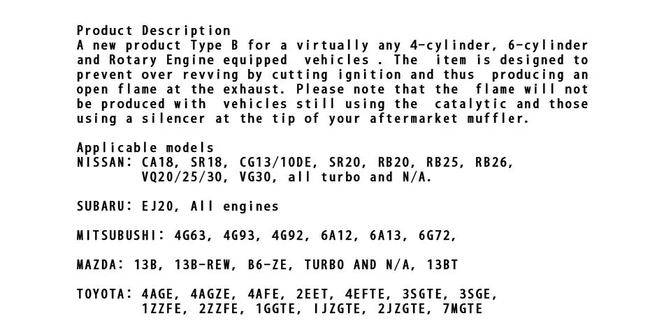 Обратите внимание, что пламя не будет произведено с транспортными средствами, по-прежнему использующими каталитический и те, кто использует глушитель на кончике вашего послепродажного глушителя.