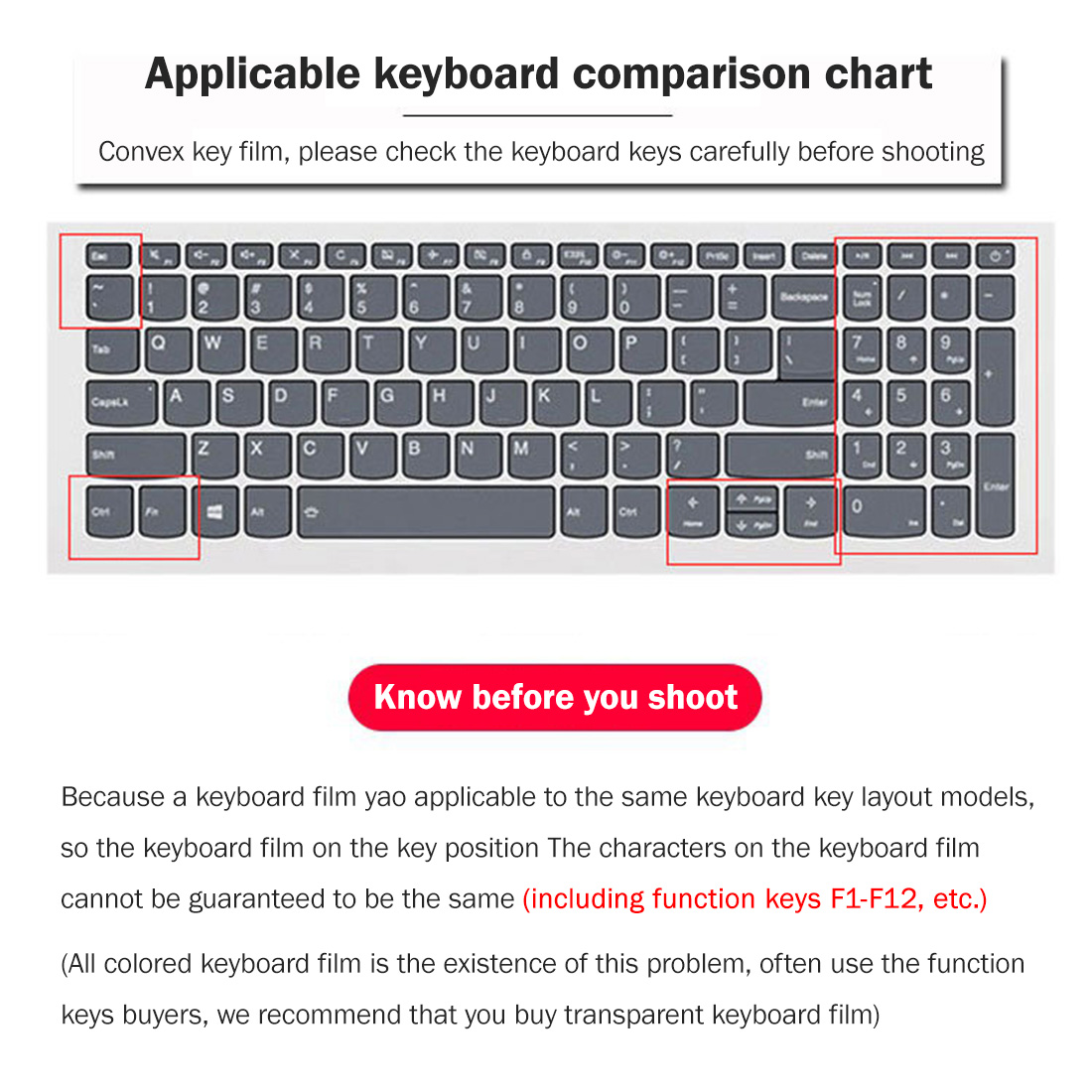 - 1. Поскольку пленка для клавиатуры подходит для моделей с одинаковым макетом, она не может гарантировать, что символы на клавиатуре будут последовательными (включая функциональные клавиши F1-F12 и т. д.). У всех цветных пленок клавиатуры есть эта проблема. Покупатели часто используют функциональные клавиши. Рекомендуется приобрести прозрачную пленку для клавиатуры).