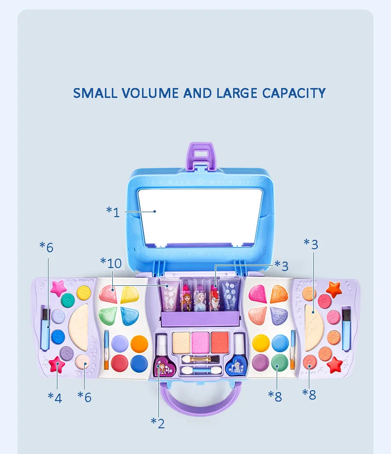 A: тени для век * 6 пудр * 3 лака для ногтей * 2 краски * 2 Румяна * 8 блеск для губ * 10 губная помада * 3 кисть для губ * 2 блеска для губ * 4 крем для теней для век * 8 губчатая кисть * 2 зеркала * 1.
