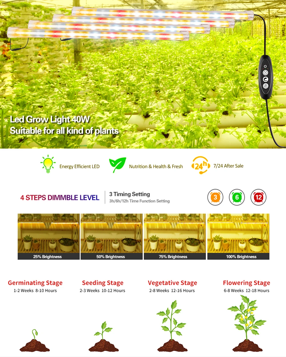 ✔【3 ч/6 ч/12 ч автоматическое управление 】 этот таймер позволяет включать и выключать его в заранее установленное время, которое имеет 3 ч, 6 ч, 12 ч 3 режима синхронизации, 3 цветных режима соответствуют 3 режимам. Когда индикатор выключен, функция таймера отключается. Внимание: Эта функция синхронизации имеет 24-часовой цикл синхронизации. В случае непрерывной мощности цикл будет работать, и он будет недействителен после отключения питания. Не беспокойтесь о том, что вы забудете включить светильник для ваших растений, когда вы заняты.