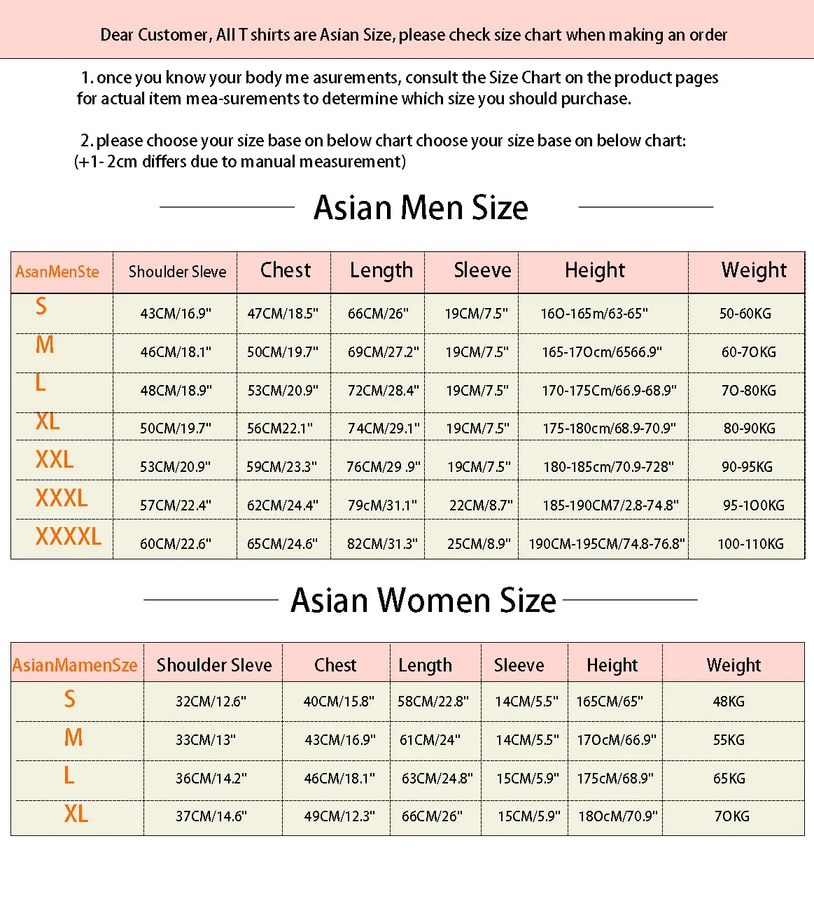 Note 1: We are Asia Size. Asia Size is a little smaller than US size. 1inch=2.54cm, 1cm=0.39inch