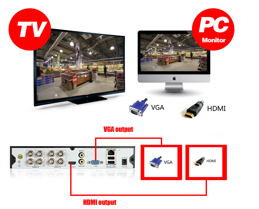 Для дополнительного удобства видеорегистратор также поставляется с разъемами VGA и BNC для стандартных вариантов просмотра разрешения.