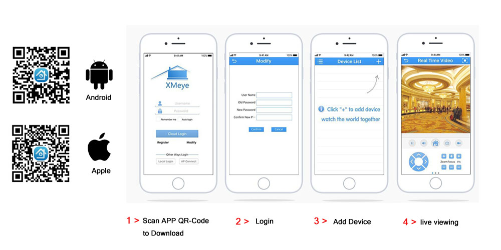 Простая настройка, всего 4 шага для просмотра мобильный телефон, просмотра видео в режиме реального времени из любого места и в любое время с помощью смартфона, стола или ПК с передовой технологией P2P, вы можете получить удаленный доступ к вашей системе за считанные минуты или меньше, нет необходимости в переадресации, удаленный доступ никогда не был таким простым!