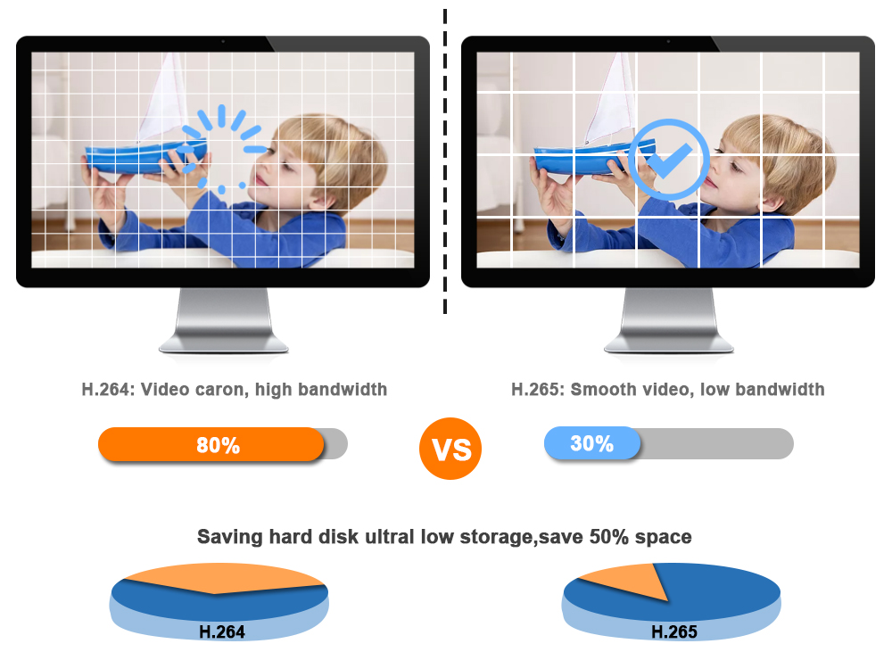 H.265 более четкий, HD разрешение предлагает вам лучшее качество изображения в более низкой скорости. Экономьте больше места для хранения, вы можете уменьшить размер файлов 40%-50%, сэкономить место для хранения HDD и снизить стоимость покупки.