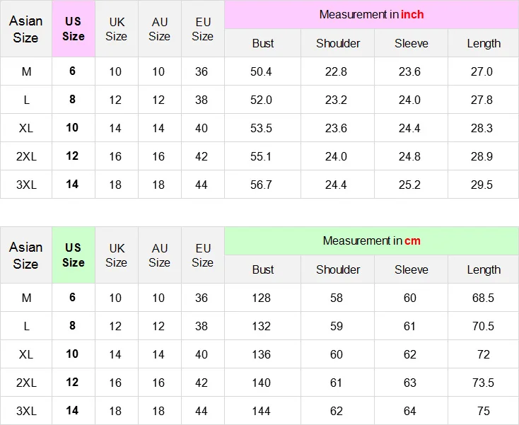 Азиатский размер меньше, чем Европейский/американский размер. Пожалуйста, проверьте детальные измерения, но не выбирайте по привычке.