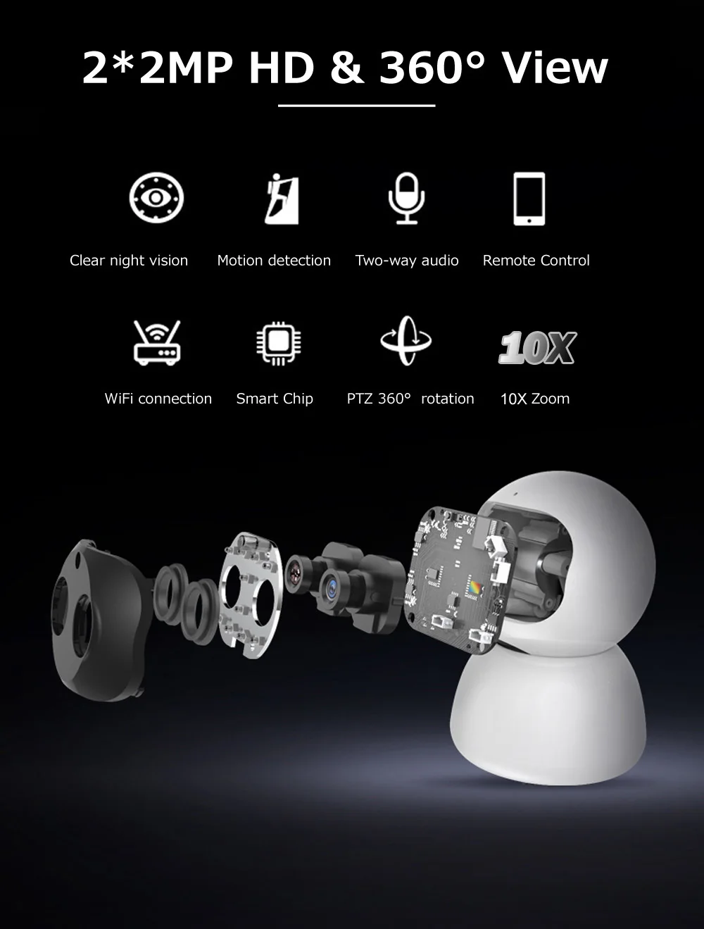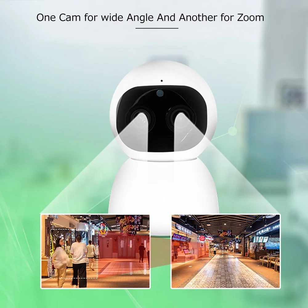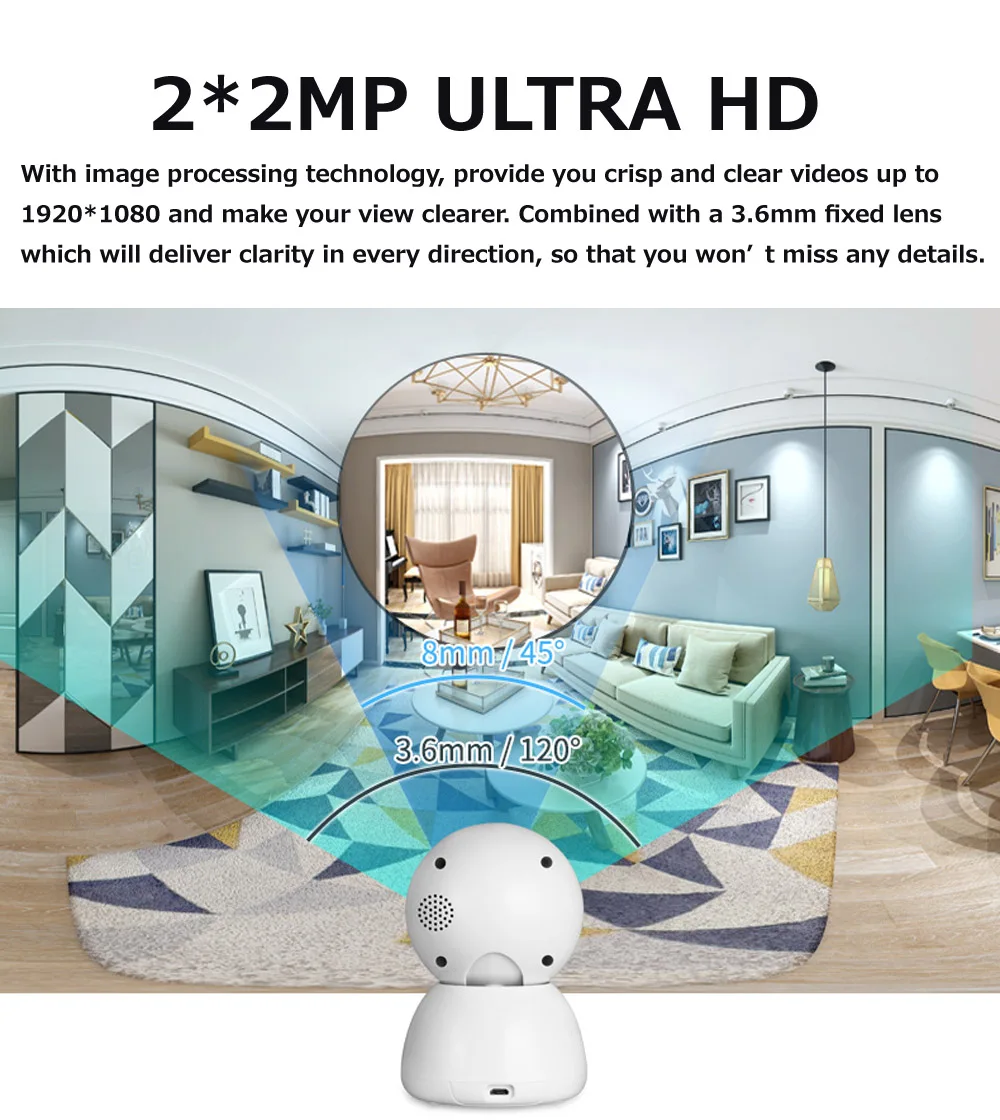 【 1080P HD WiFi ip-камера 】предназначена для внутренней безопасности с 2шт * 1080P HD объективом (один для широкоугольного и один для длинного зума), все захваченные этой камерой будут представлены вам с помощью бесплатных видео. (Примечание: камера работает с Wi-Fi 2,4G, не поддерживает 5G сети)