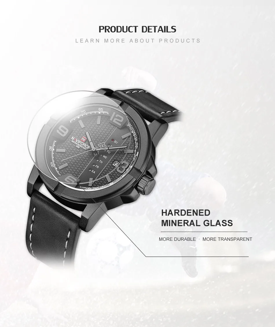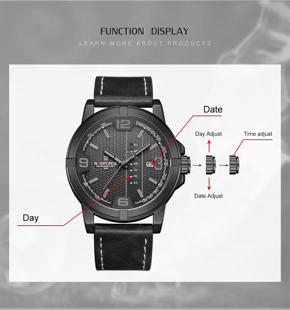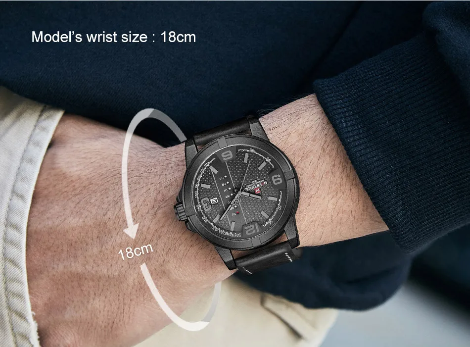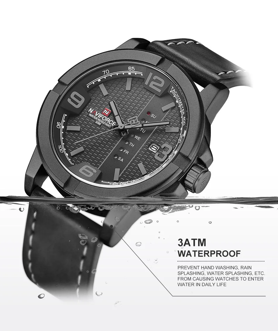 Водонепроницаемость 30 м, отображение дня и даты, большой циферблат