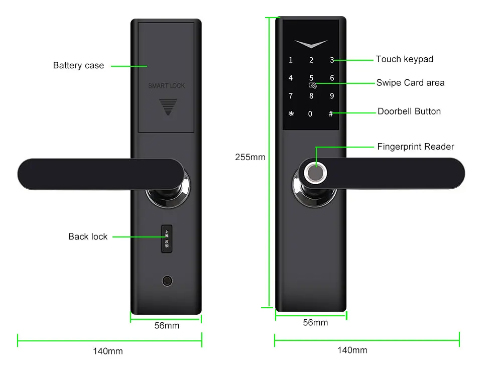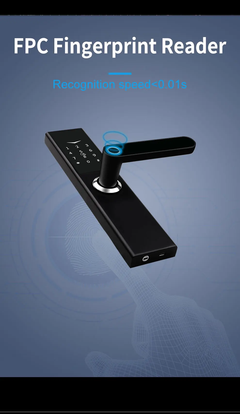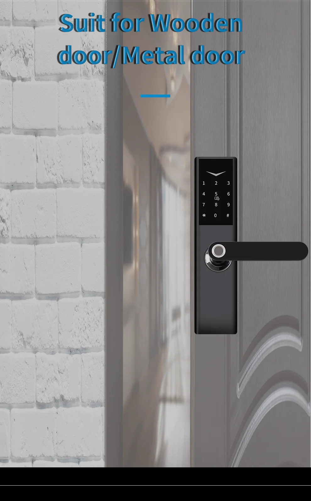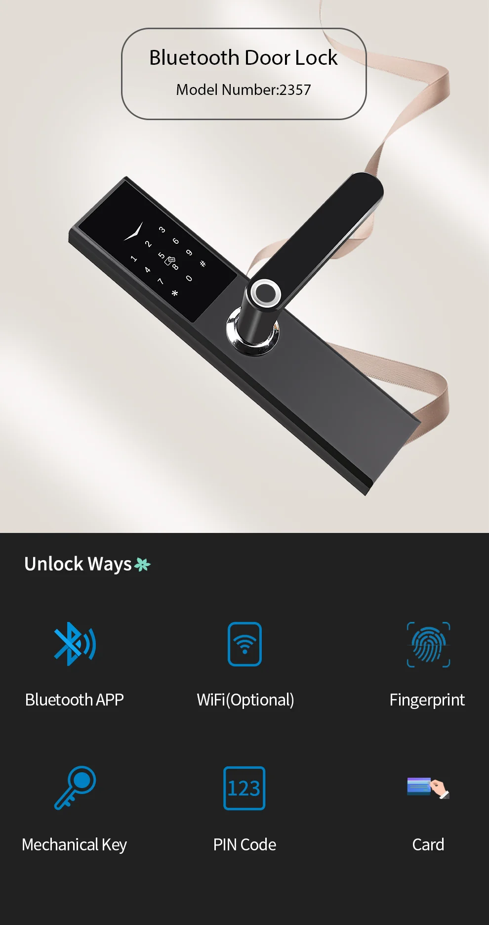 It has a convenient manage system and 6 ways to unlock: Fingerprint Unlock, WIFI Tuya APP Unlock(Optional),Password/PIN Unlock,Card Unlock and Mechanical Keys Unock.It'll meet all your need about smart lock.With advanced APP management, via WiFi to connect the smart lock to your smartphone, and you can manage your smart door lock anywhere and anytime.